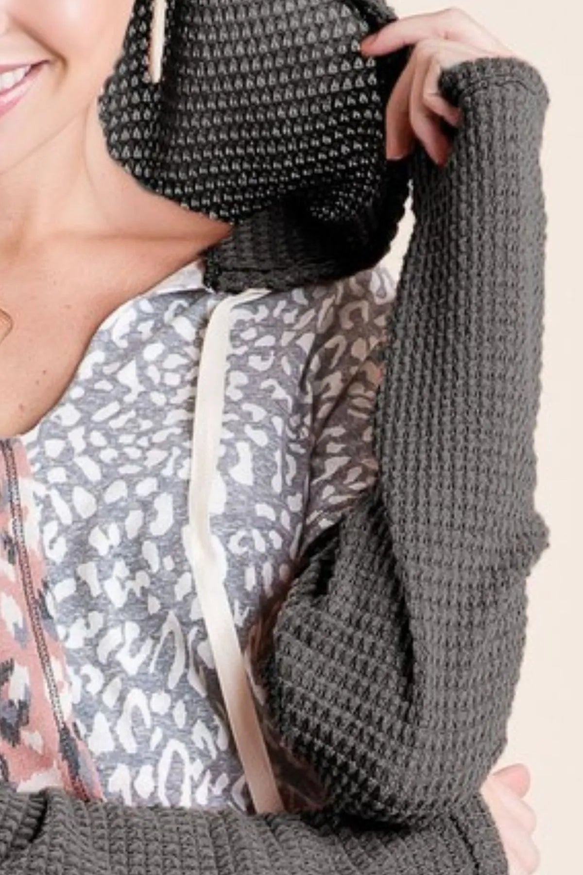 BiBi Popcorn Waffle Knit Hoodie With Print Block Front