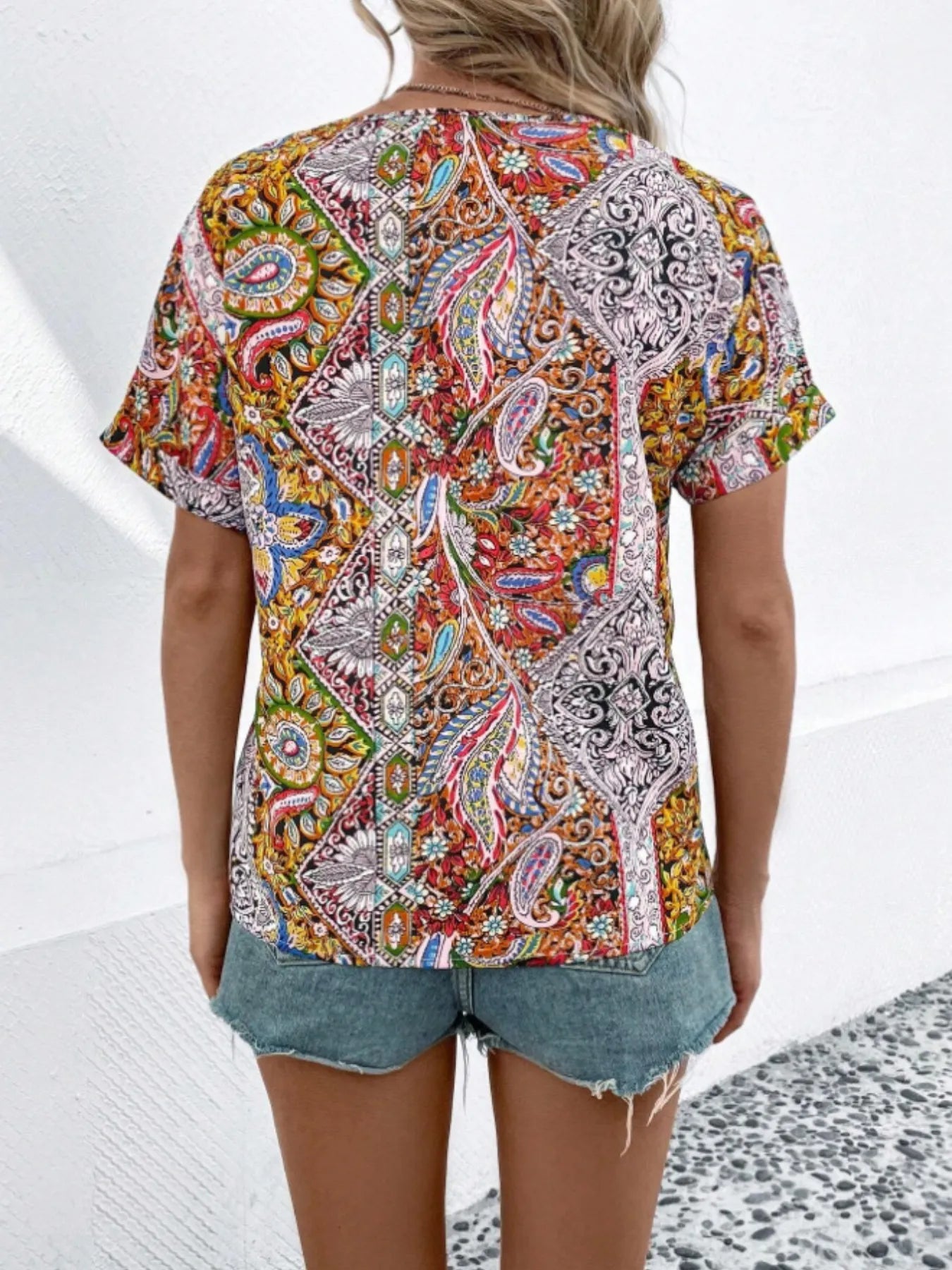 Bohemian Paisley Print V-Neck Short Sleeve T-Shirt