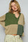 This stylish color block patchwork T-shirt features a unique geometric design combining earthy green and beige tones. Made from comfortable cotton blend fabric with ribbed texture panels, it offers a relaxed oversized fit perfect for casual wear. The V-neckline with decorative scalloped trim adds feminine detail, while the long sleeves provide versatile coverage. The innovative patchwork construction creates visual interest through contrasting textures and colors, making it a standout piece for modern streetwear styling.