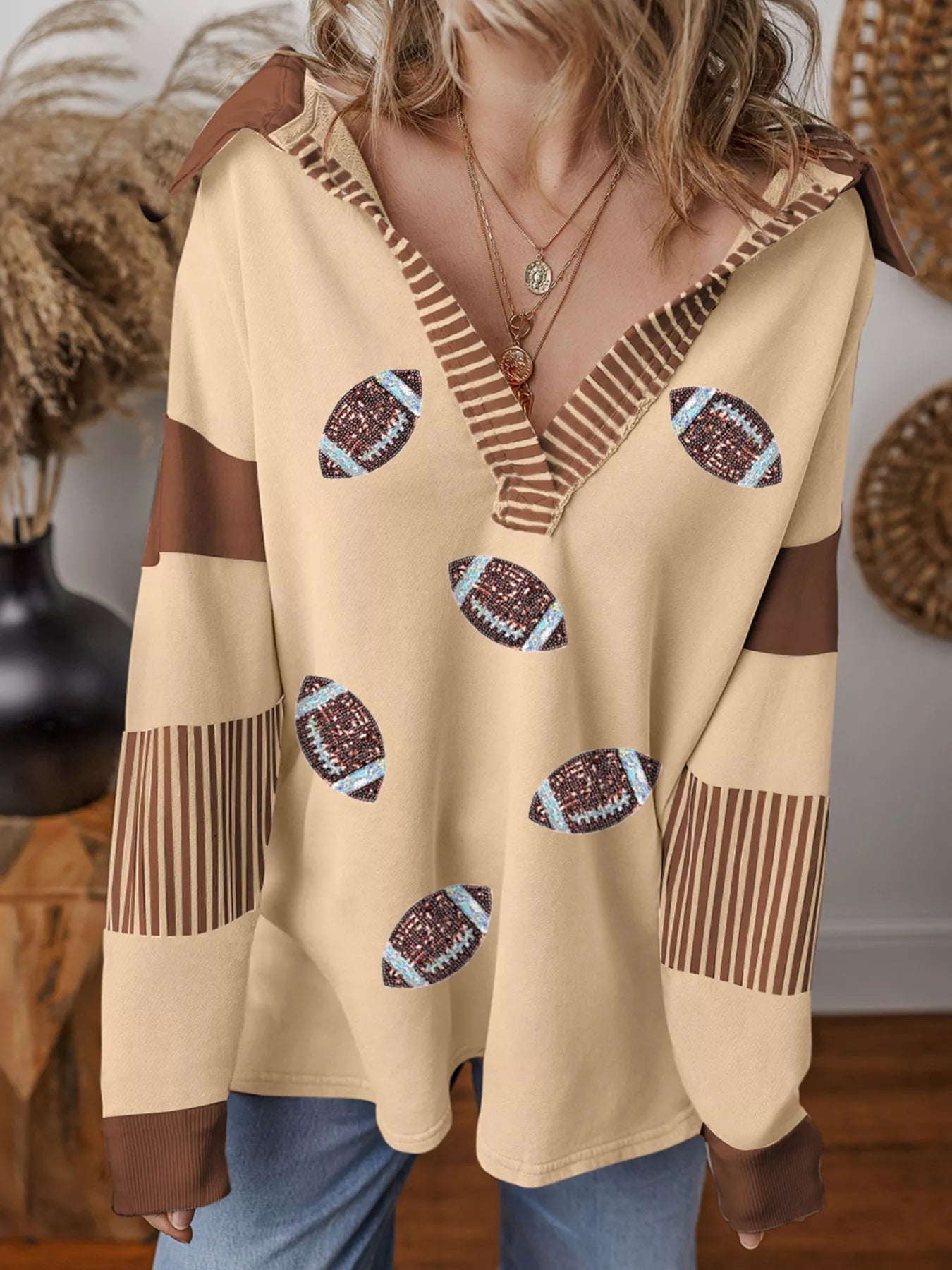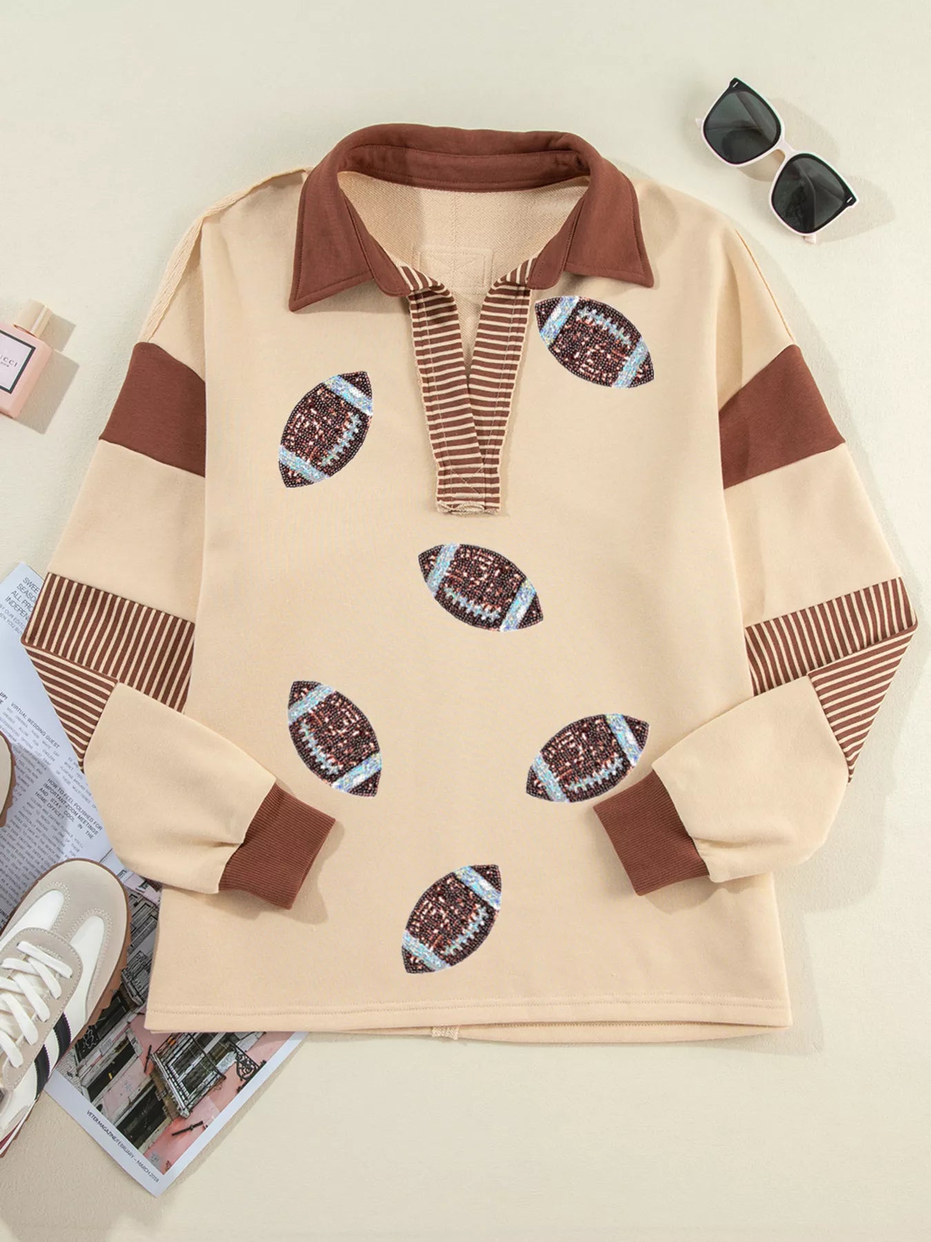 Color Block Striped Patchwork Sequin Rugby Graphic Polo Sweatshirt