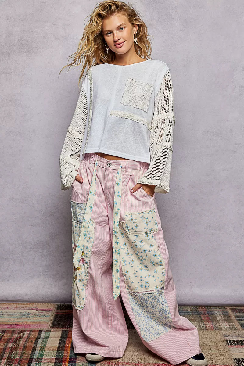 POL Round Neck Washed Top with Crochet See Through Sleeves