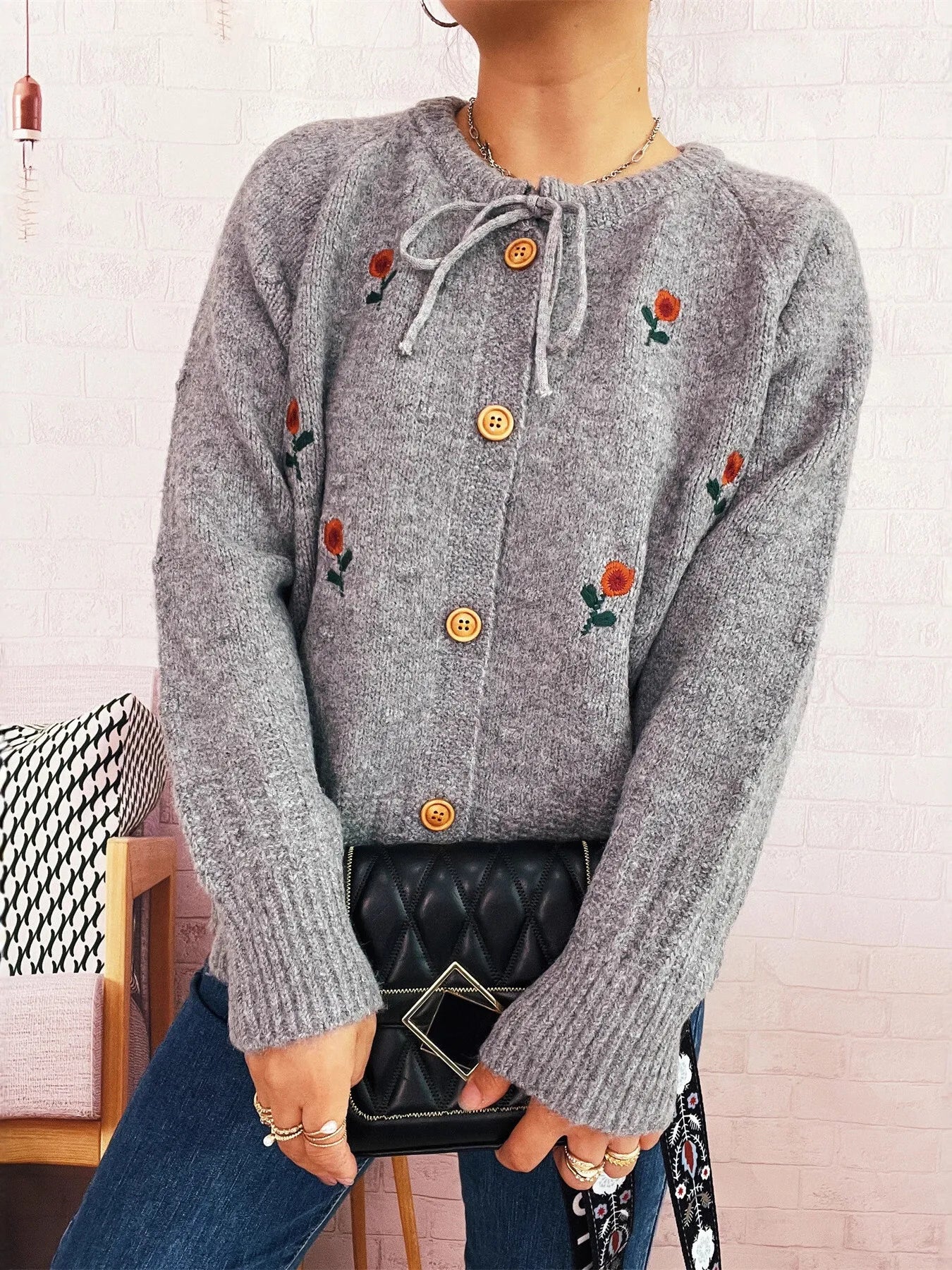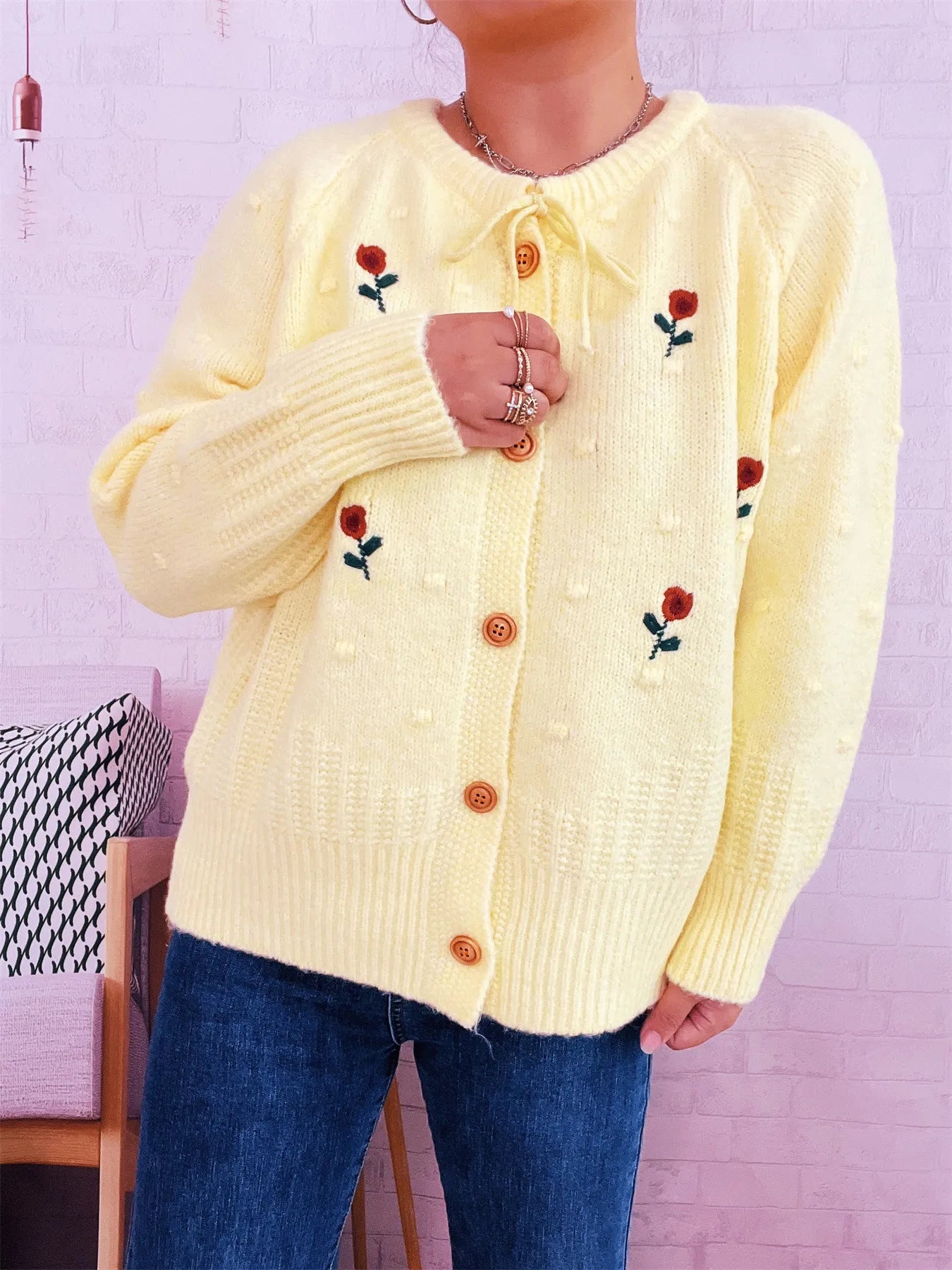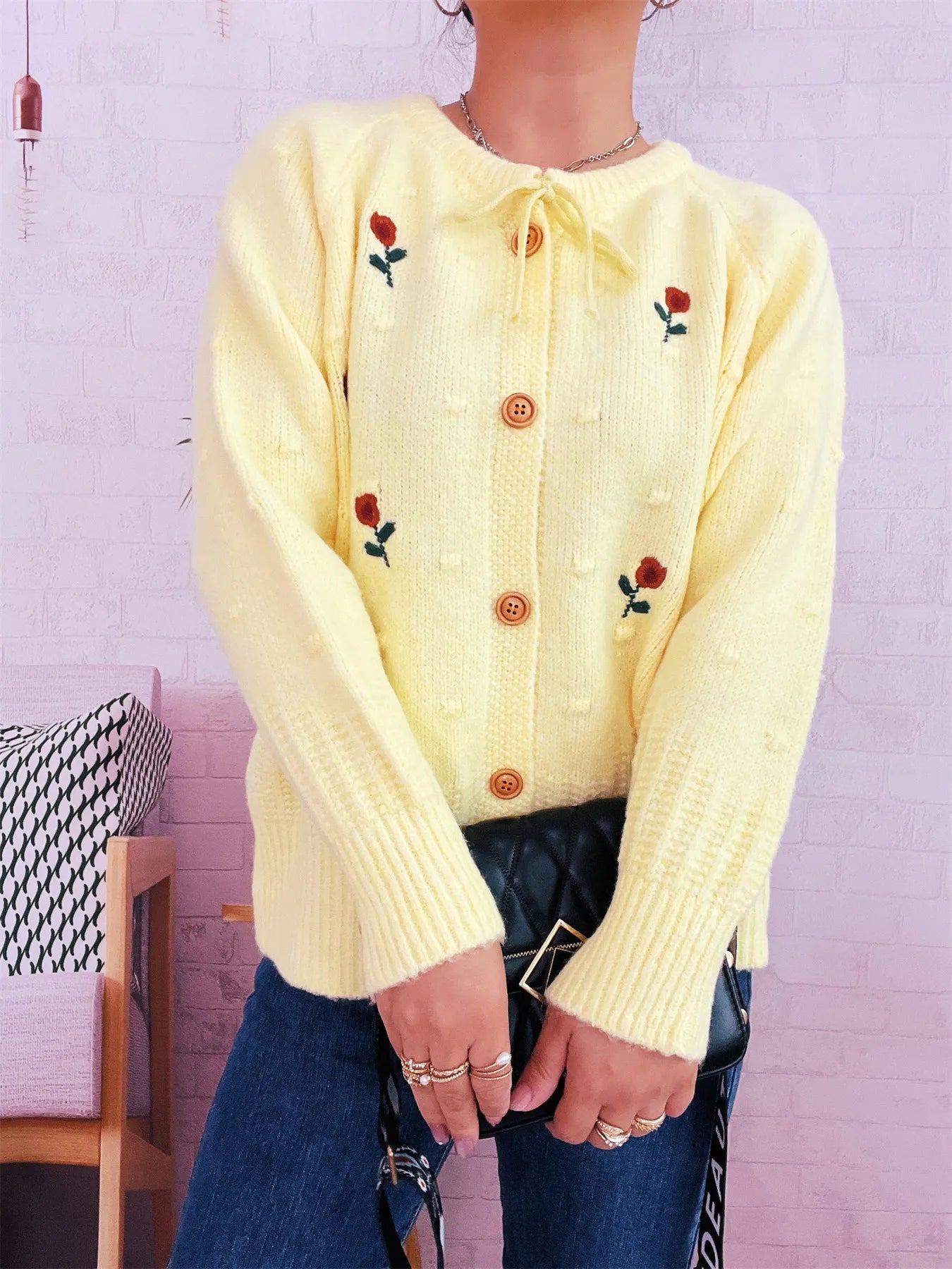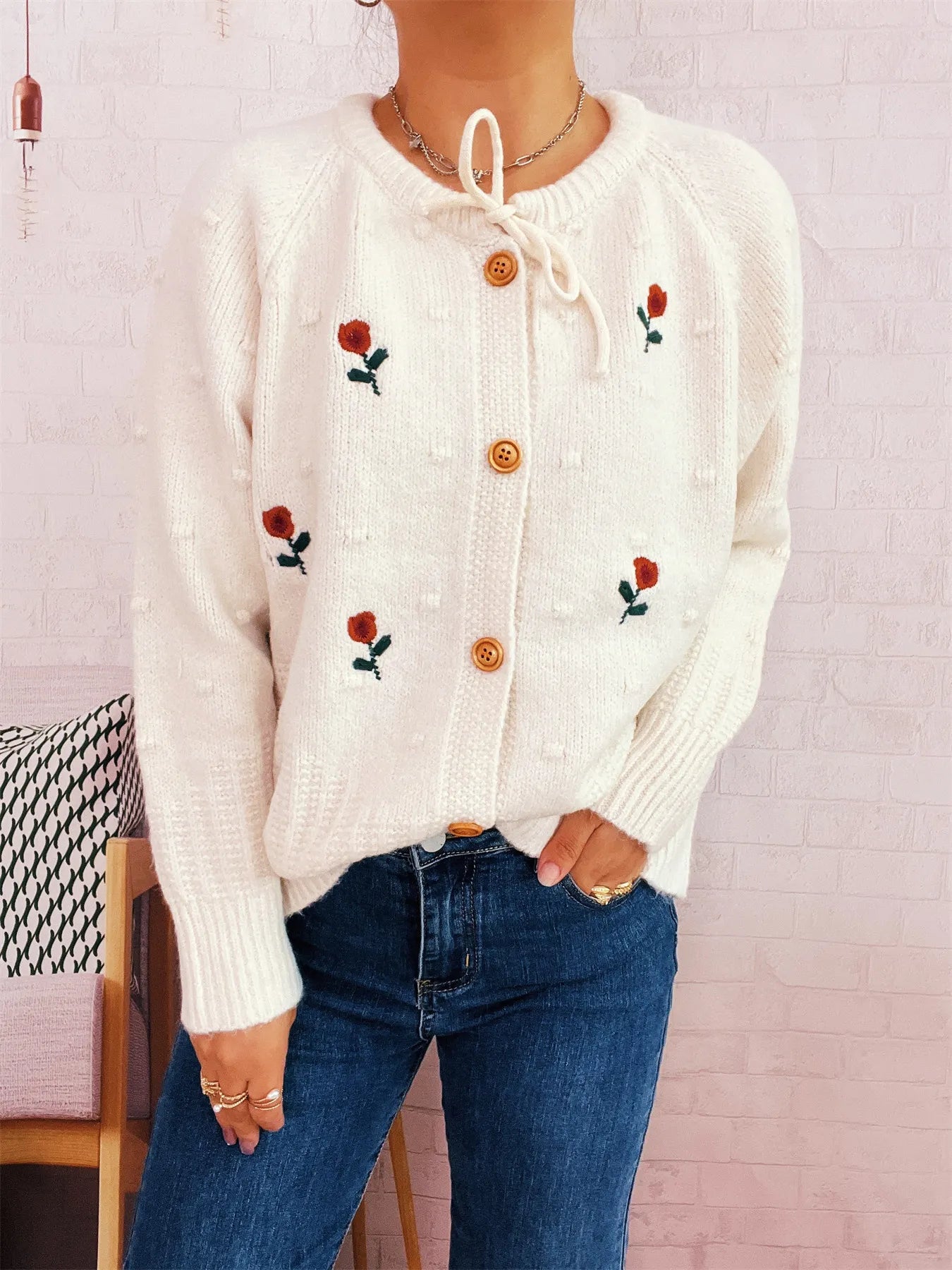 Rose Embroidered Button-Up Cardigan