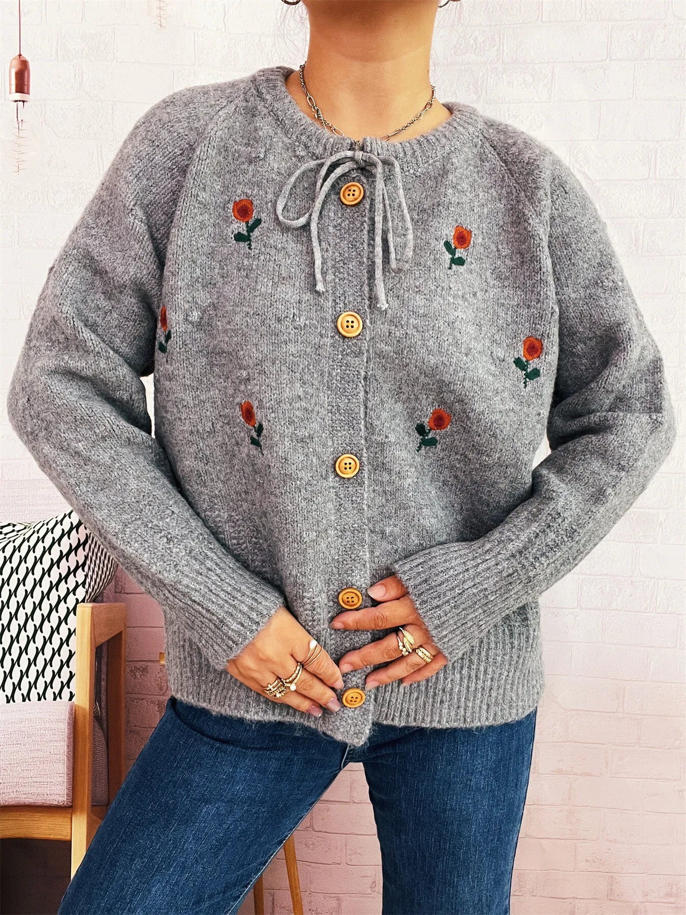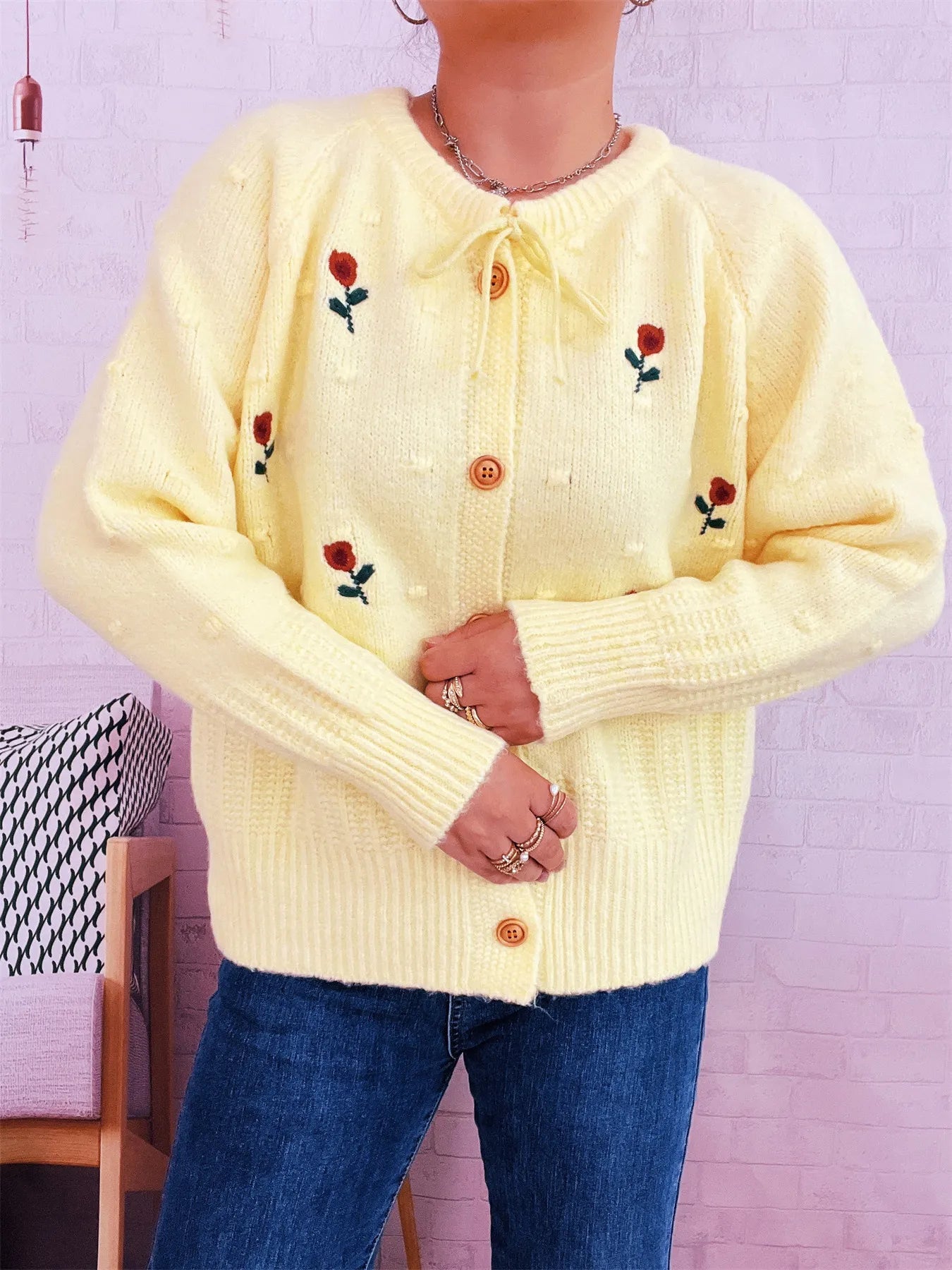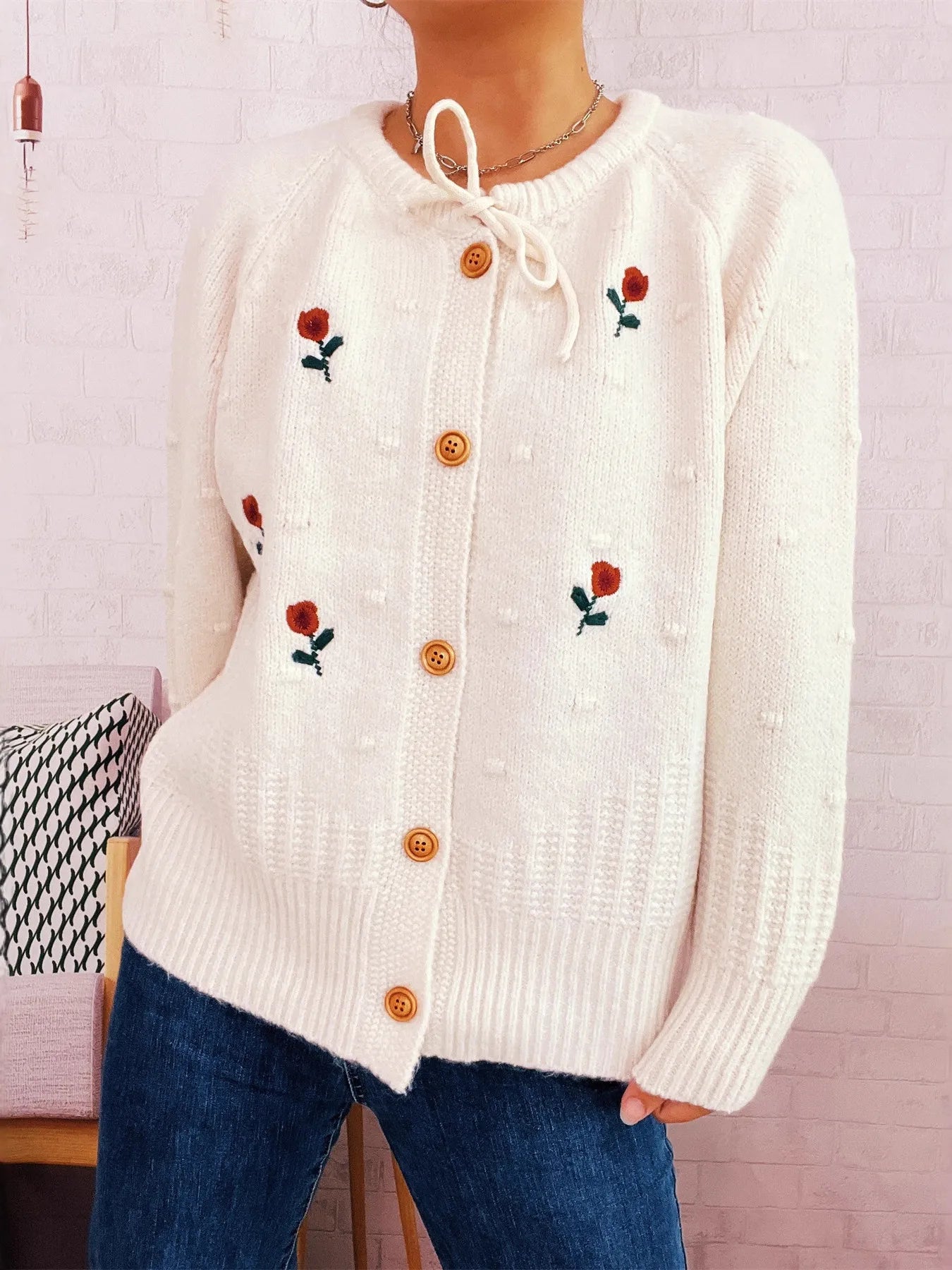 Rose Embroidered Button-Up Cardigan