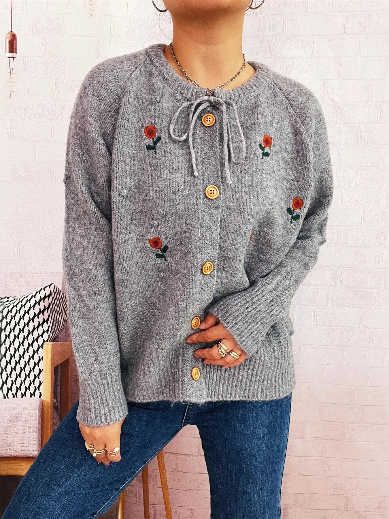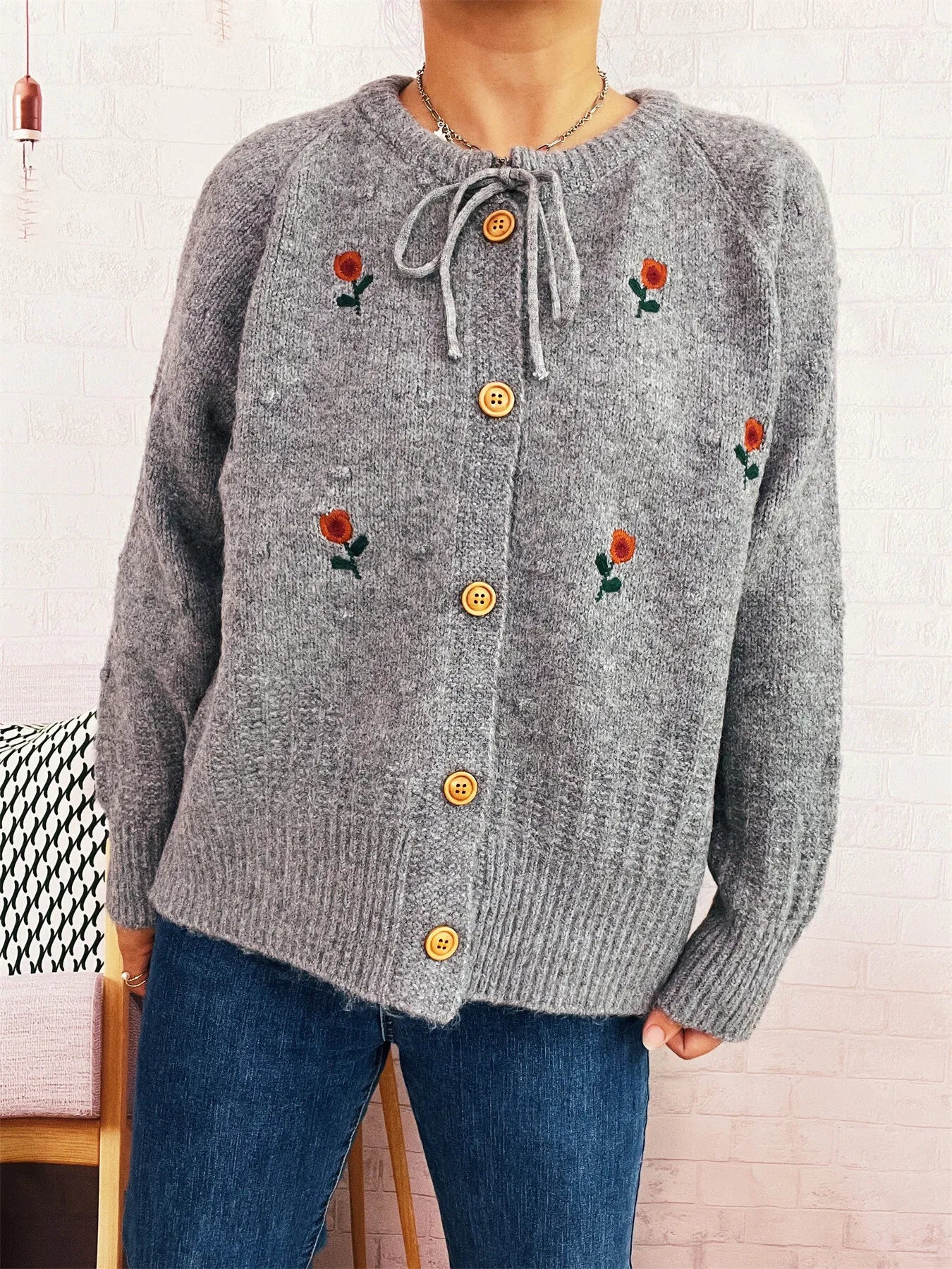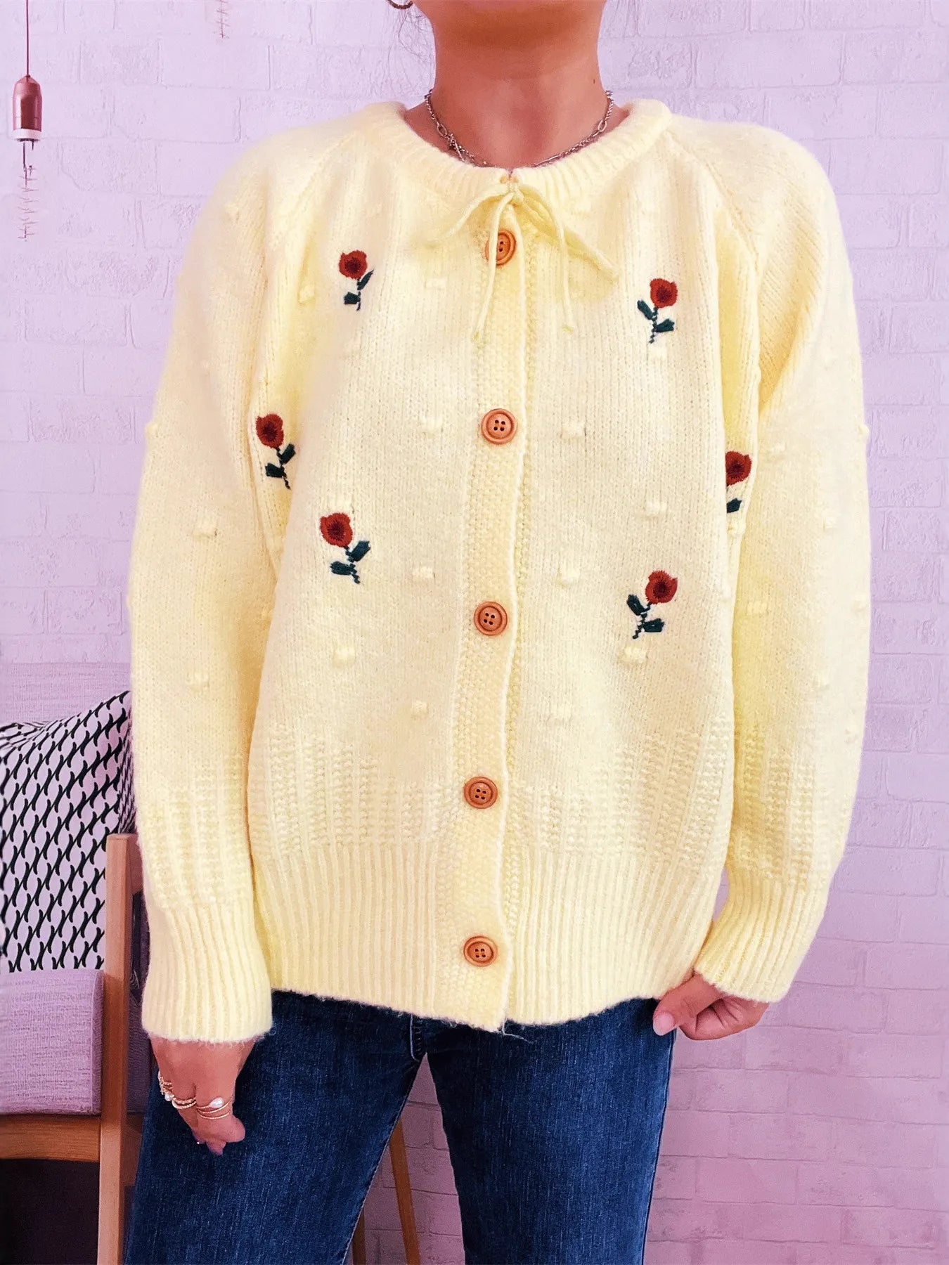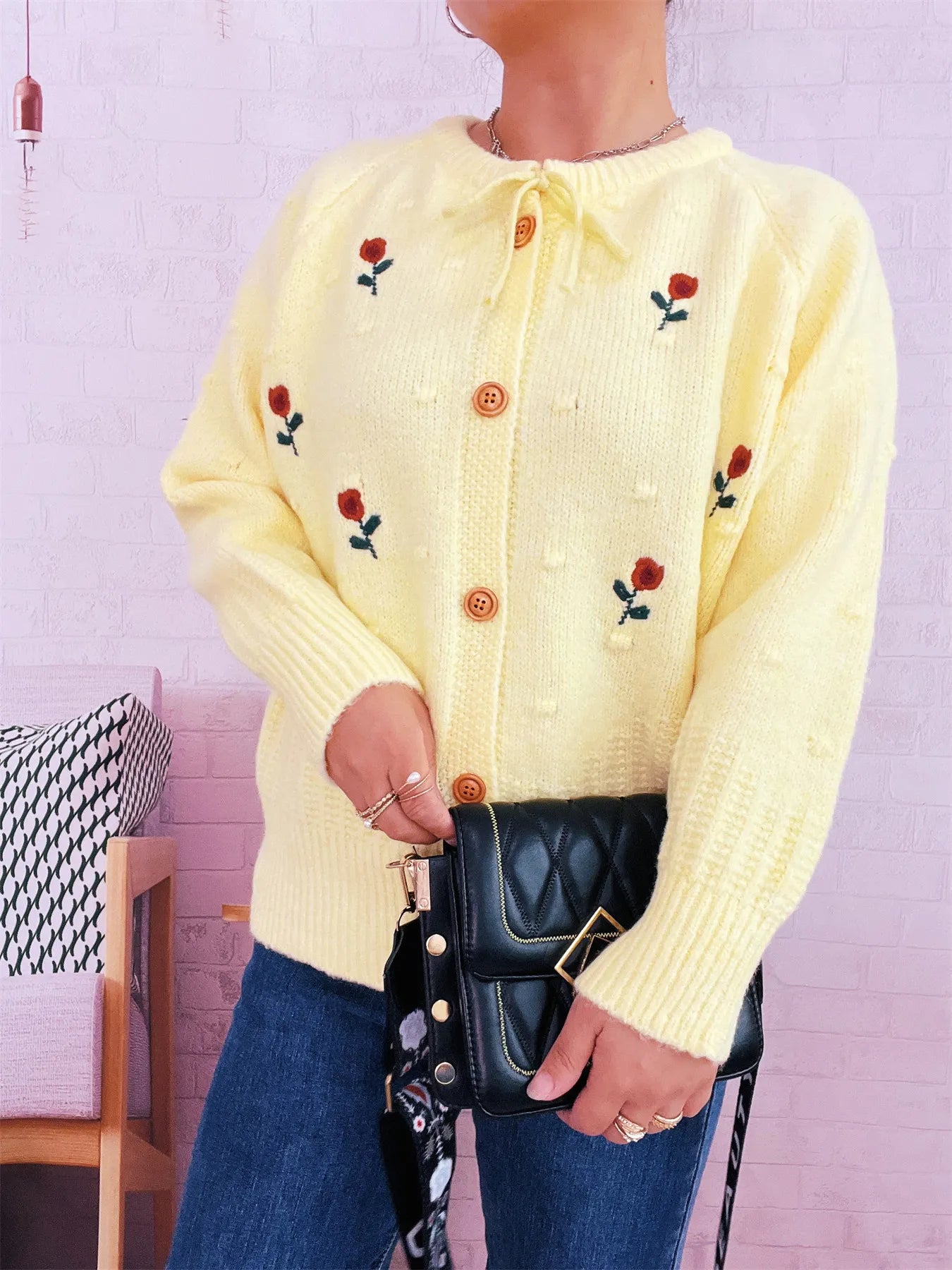Rose Embroidered Button-Up Cardigan