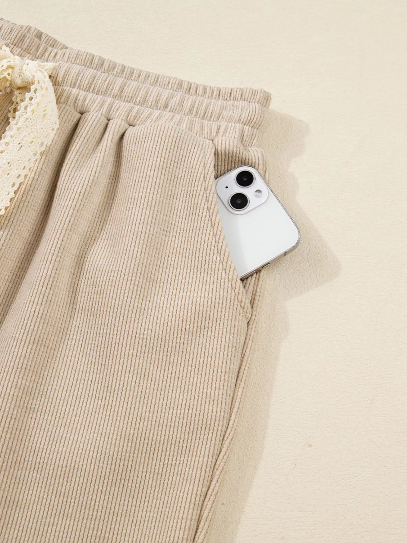 Lace Drawstring Hoodie and High Waist Pants Corduroy Suit