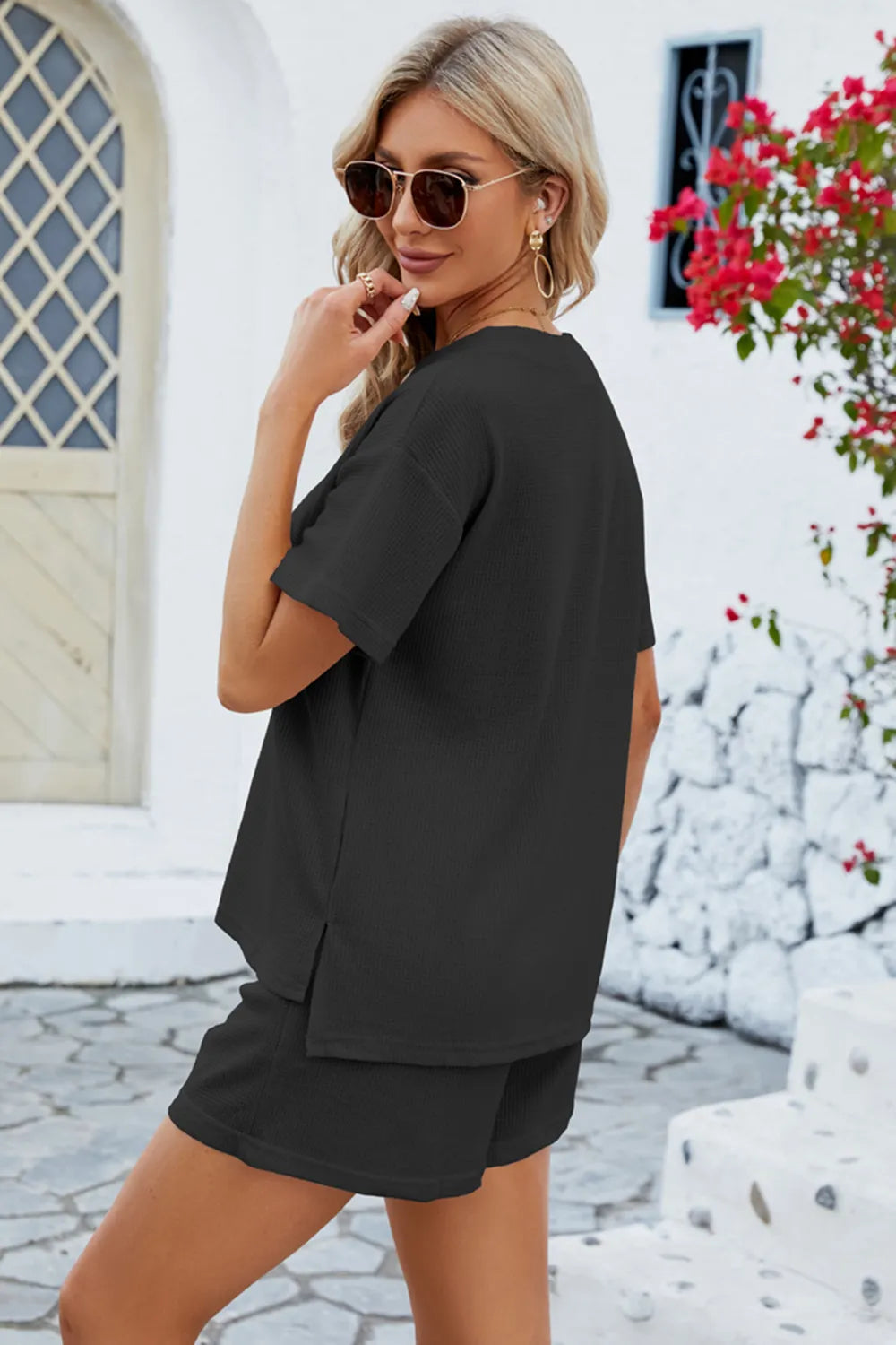 Notched Button Detail Dropped Shoulder Top and Shorts Set