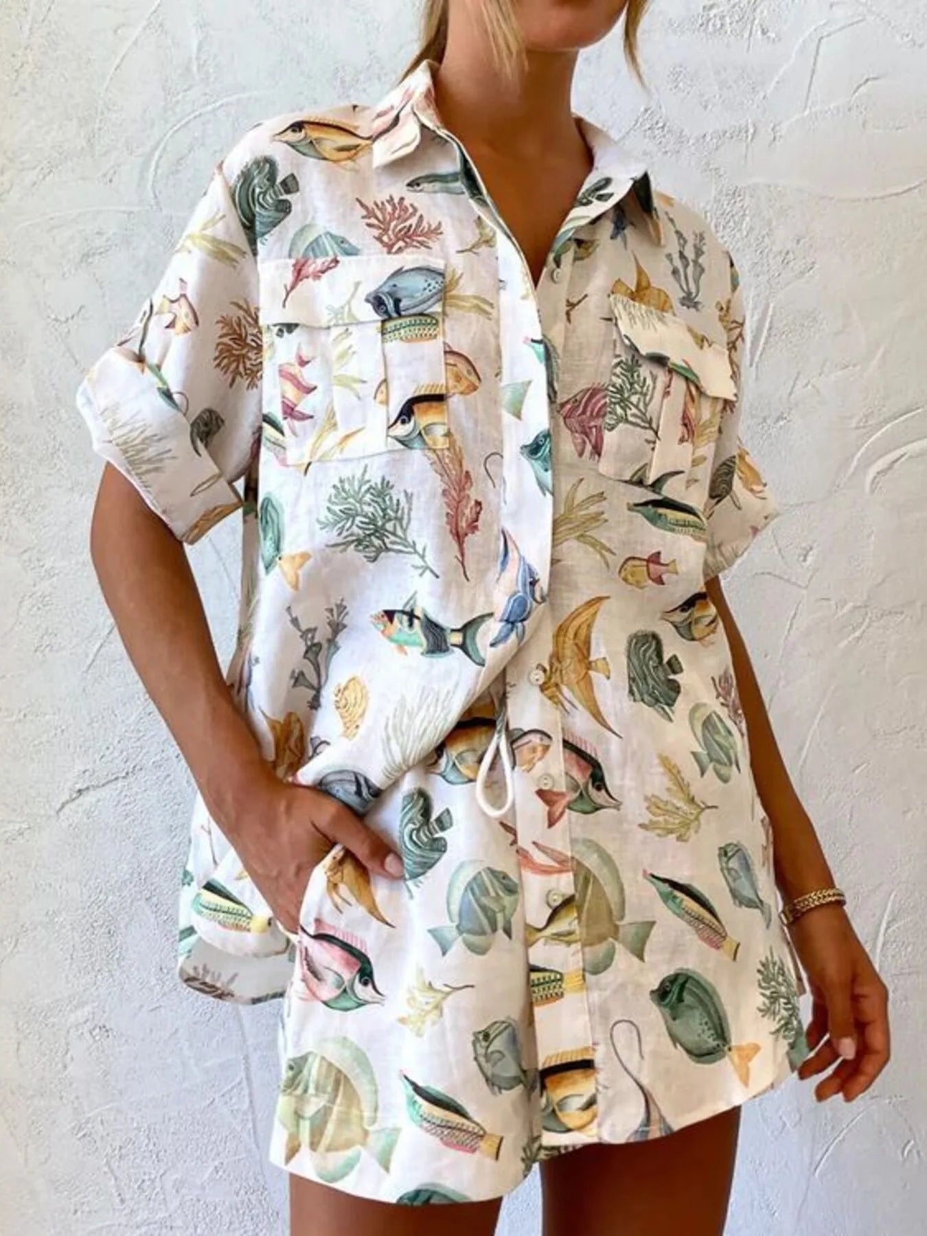 Tropical Print Oversized Button-Up Shirt and Shorts Set