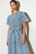 A washed denim midi dress featuring china collar, front button down, short puff sleeve, self sash and full skirt.