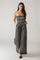 A washed denim jumpsuit featuring sequin denim tube top, washed denim pant with pleats and side pocket and back zipper closure