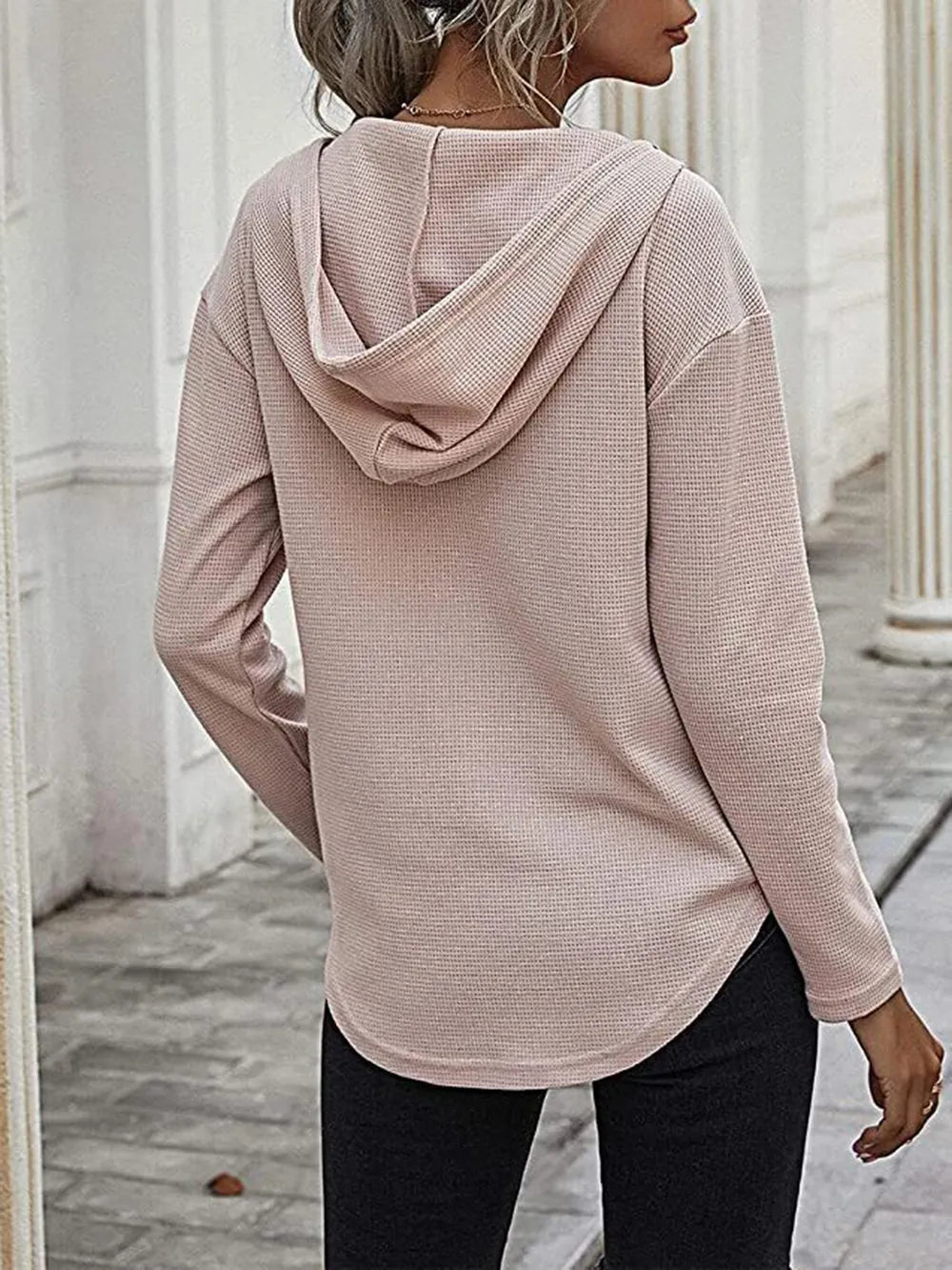 Drawstring Waffle Knit Long Sleeve Hooded Top