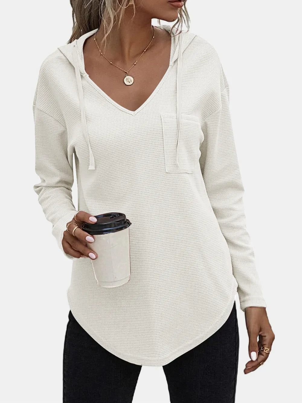 - Features: Waffle-Knit, Pocketed, Drawstring