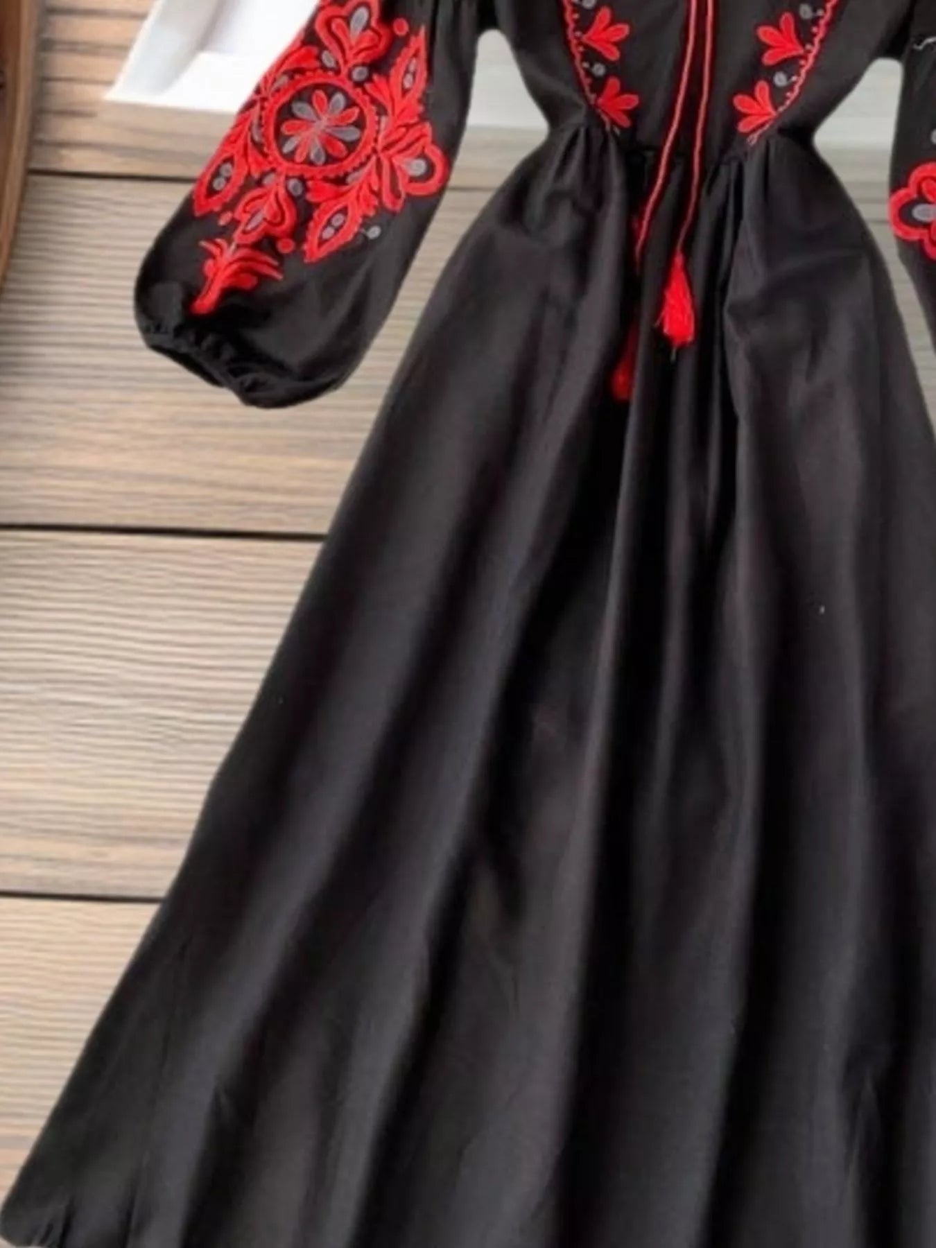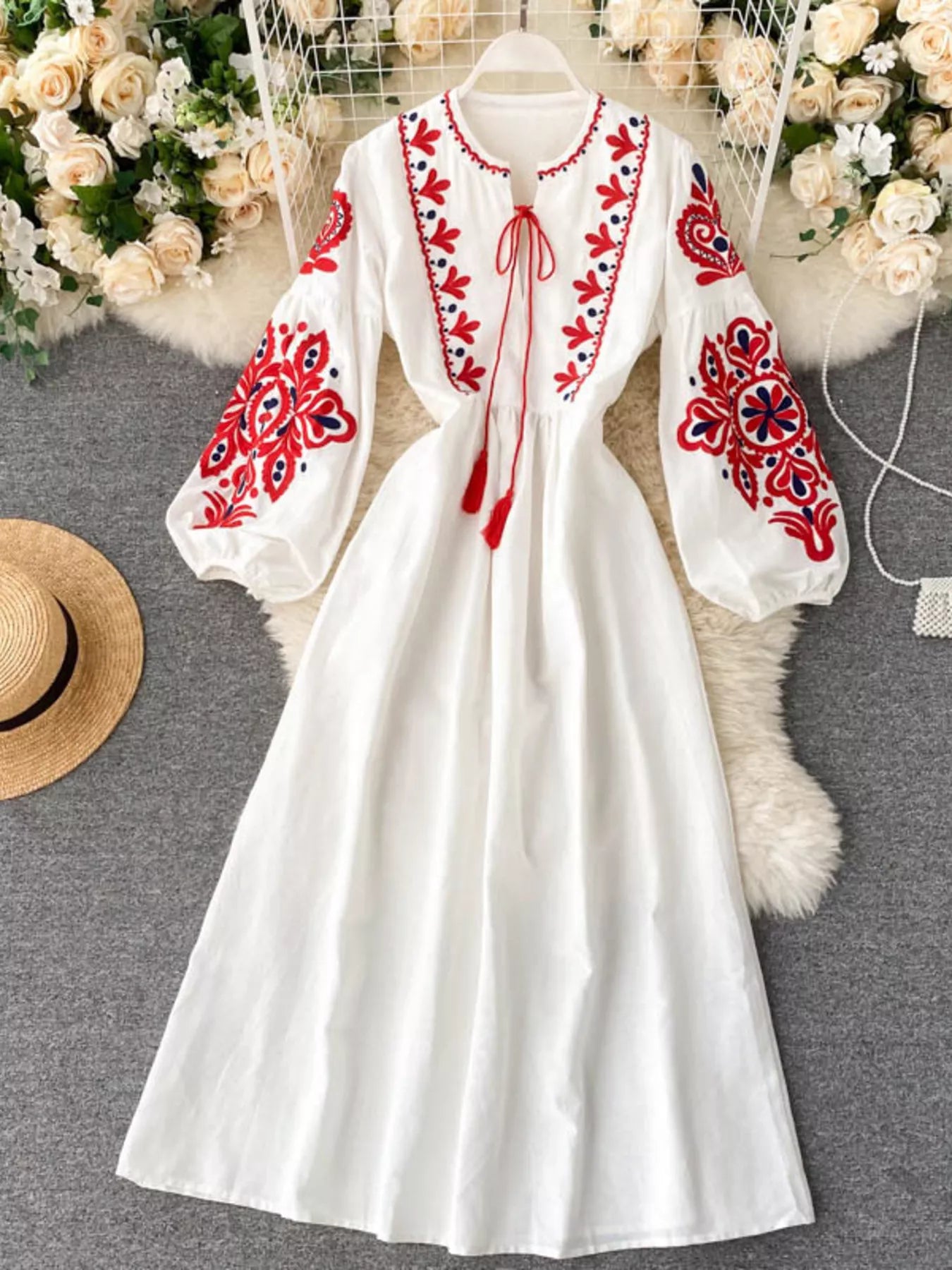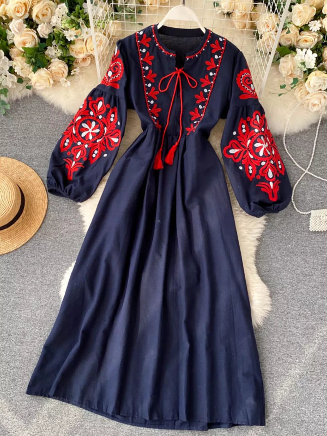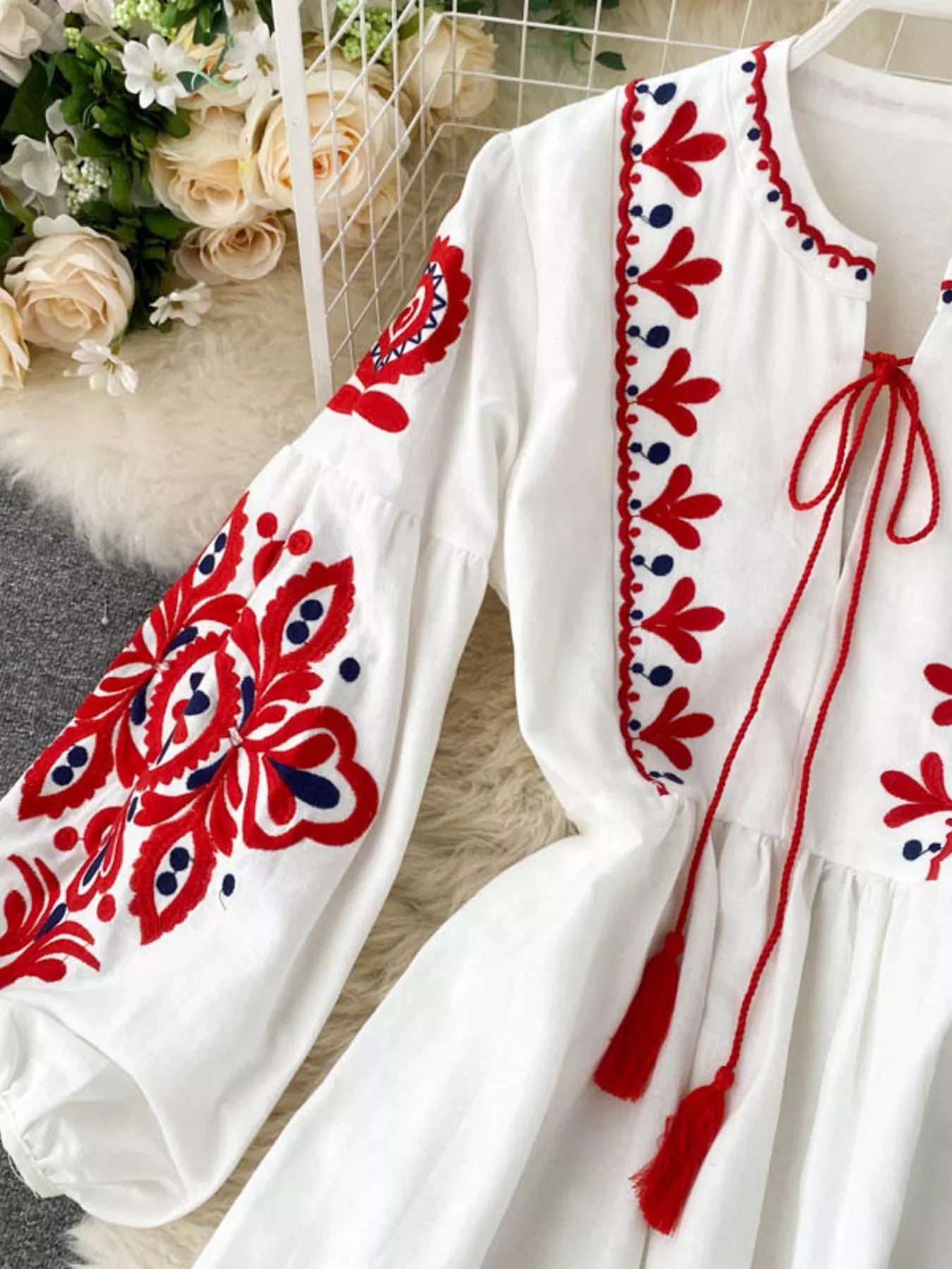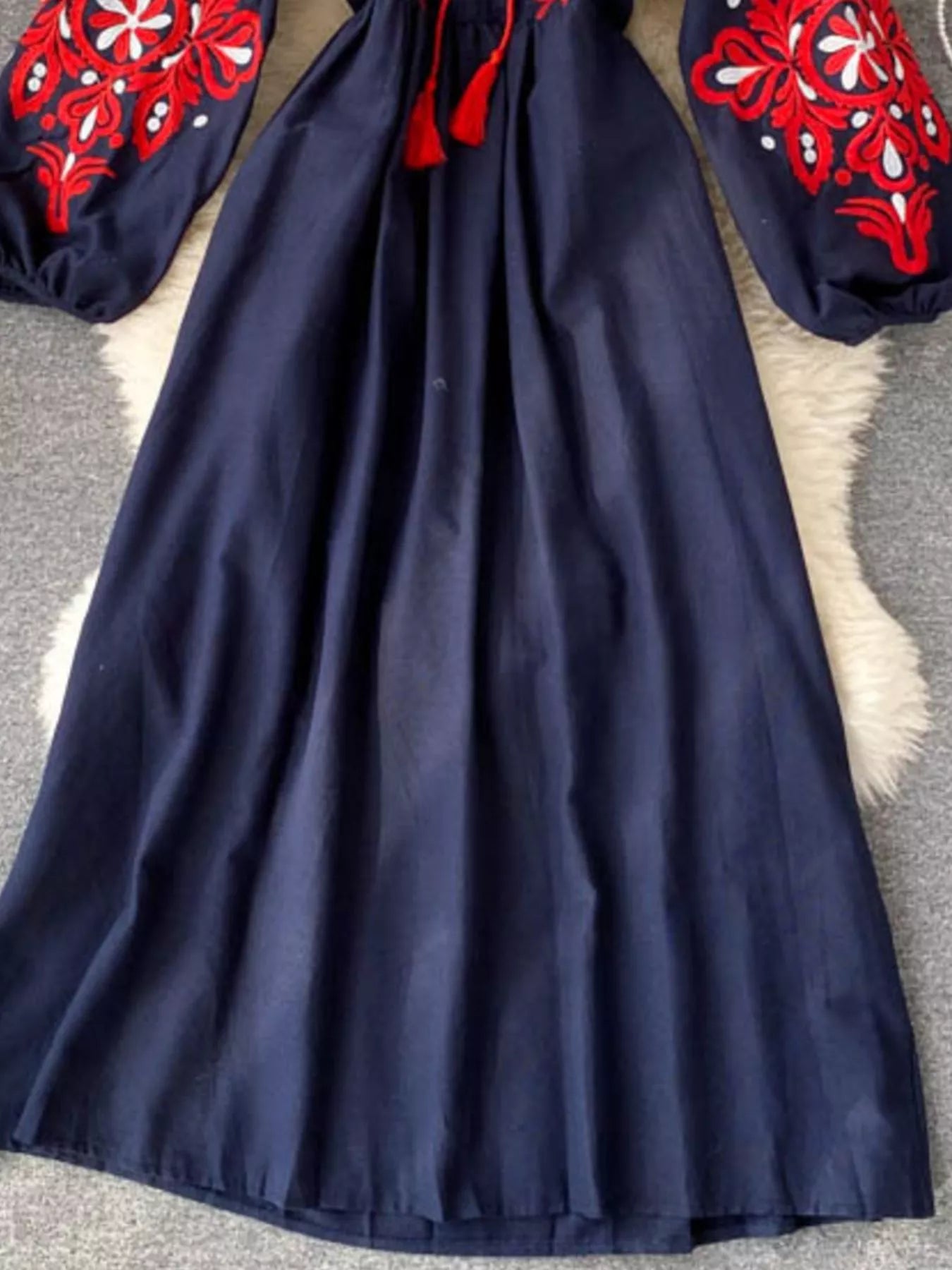 Embroidered Tie Neck Long Sleeve Dress