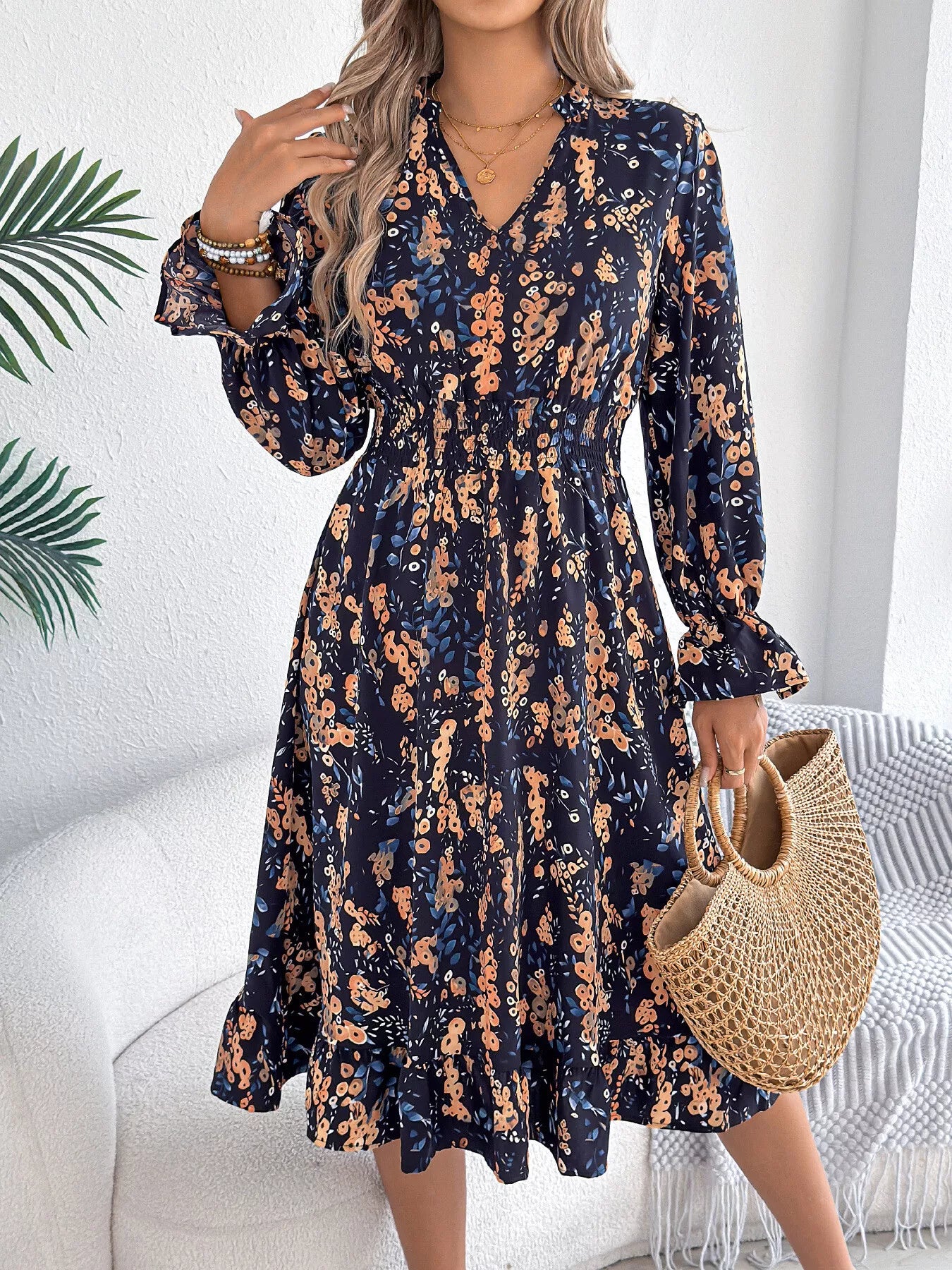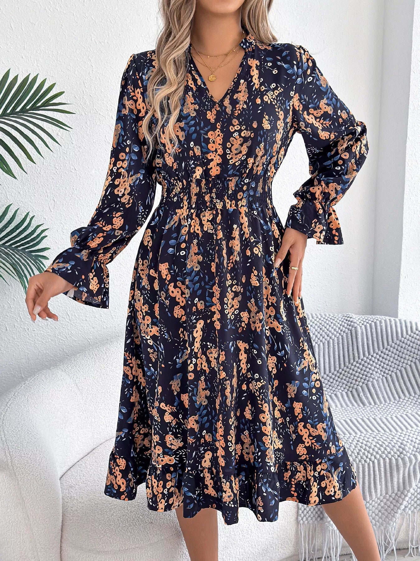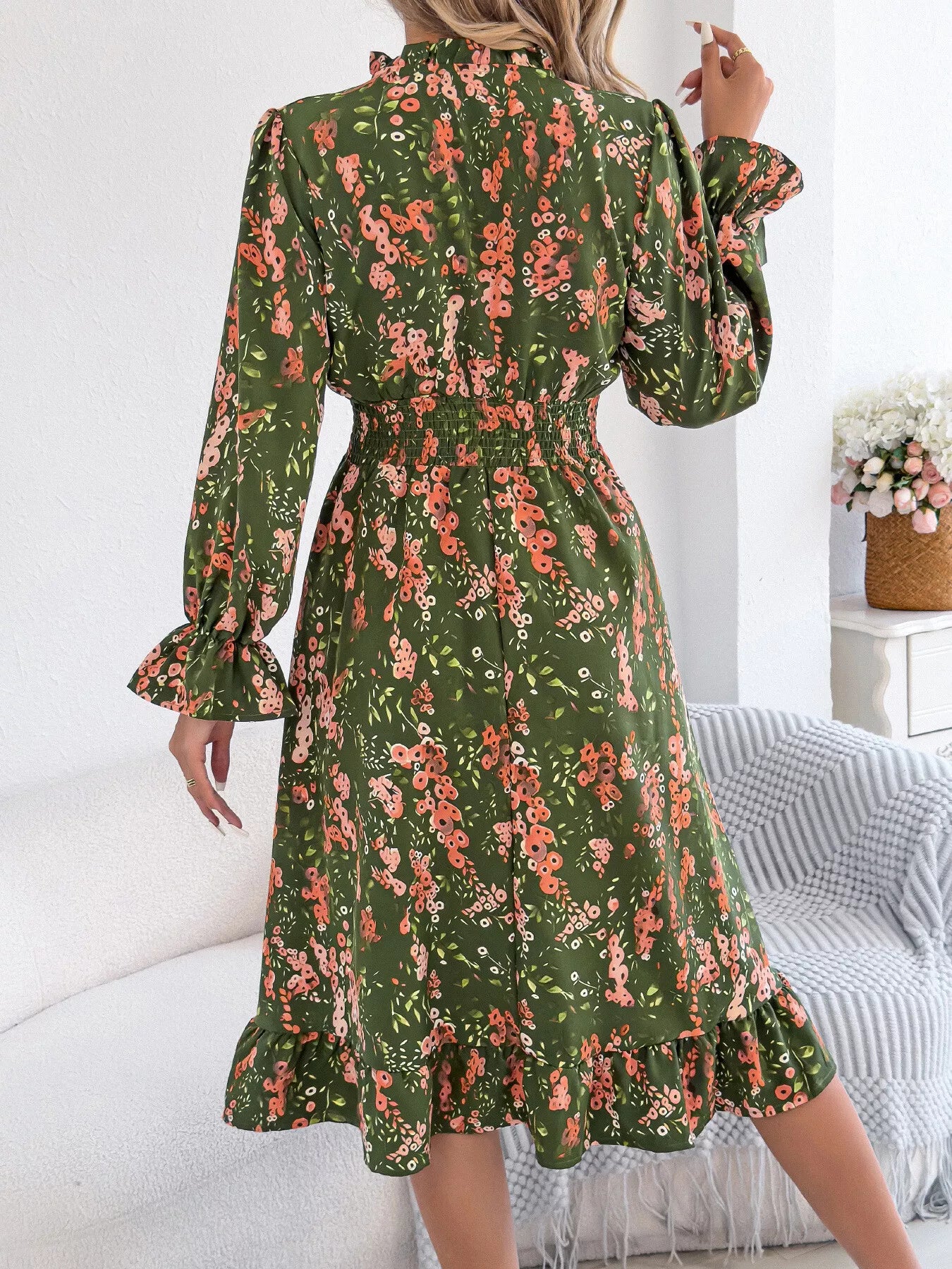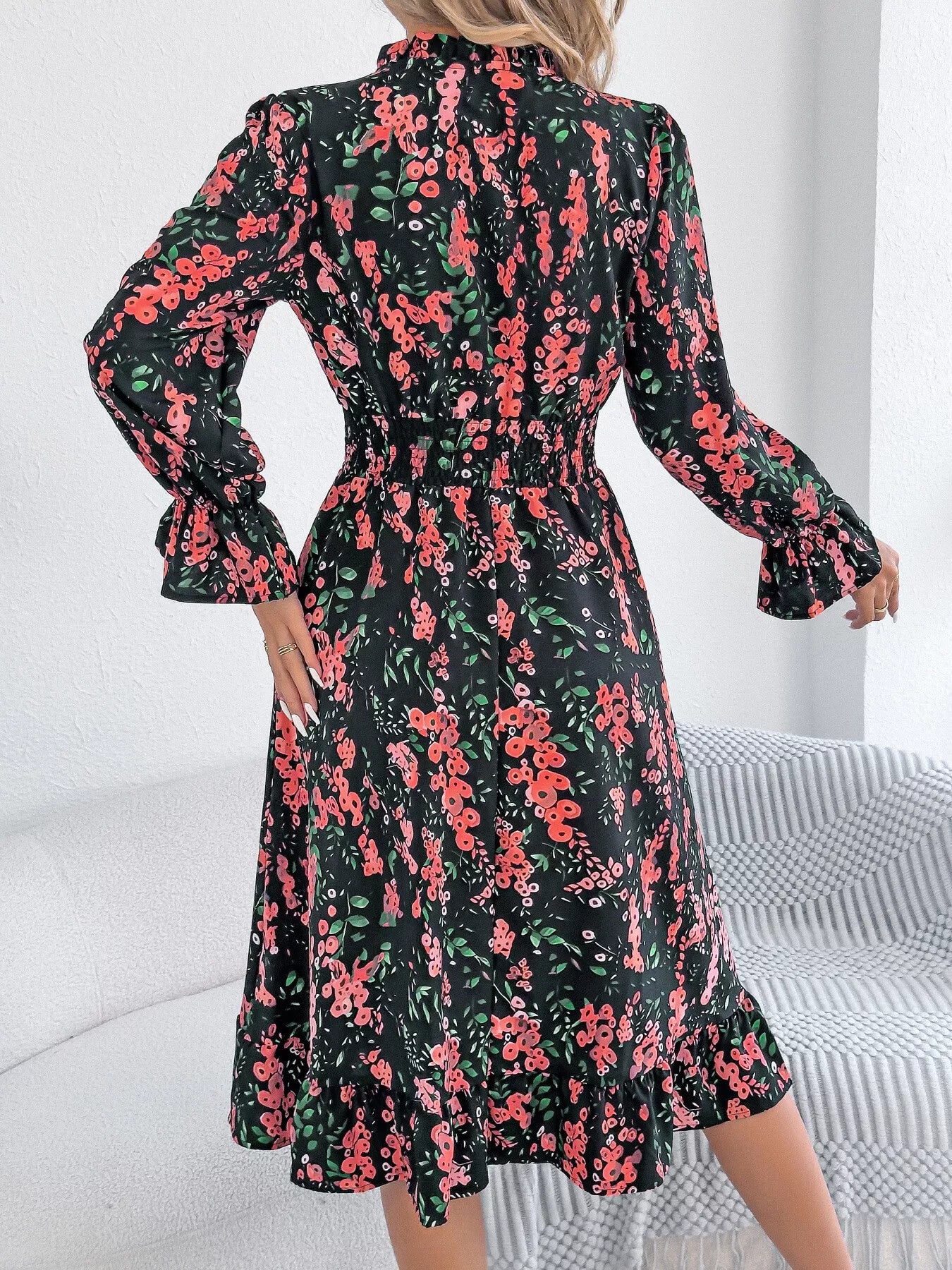 Floral Print Ruffle Hem Flounce Sleeve A-Line Dress