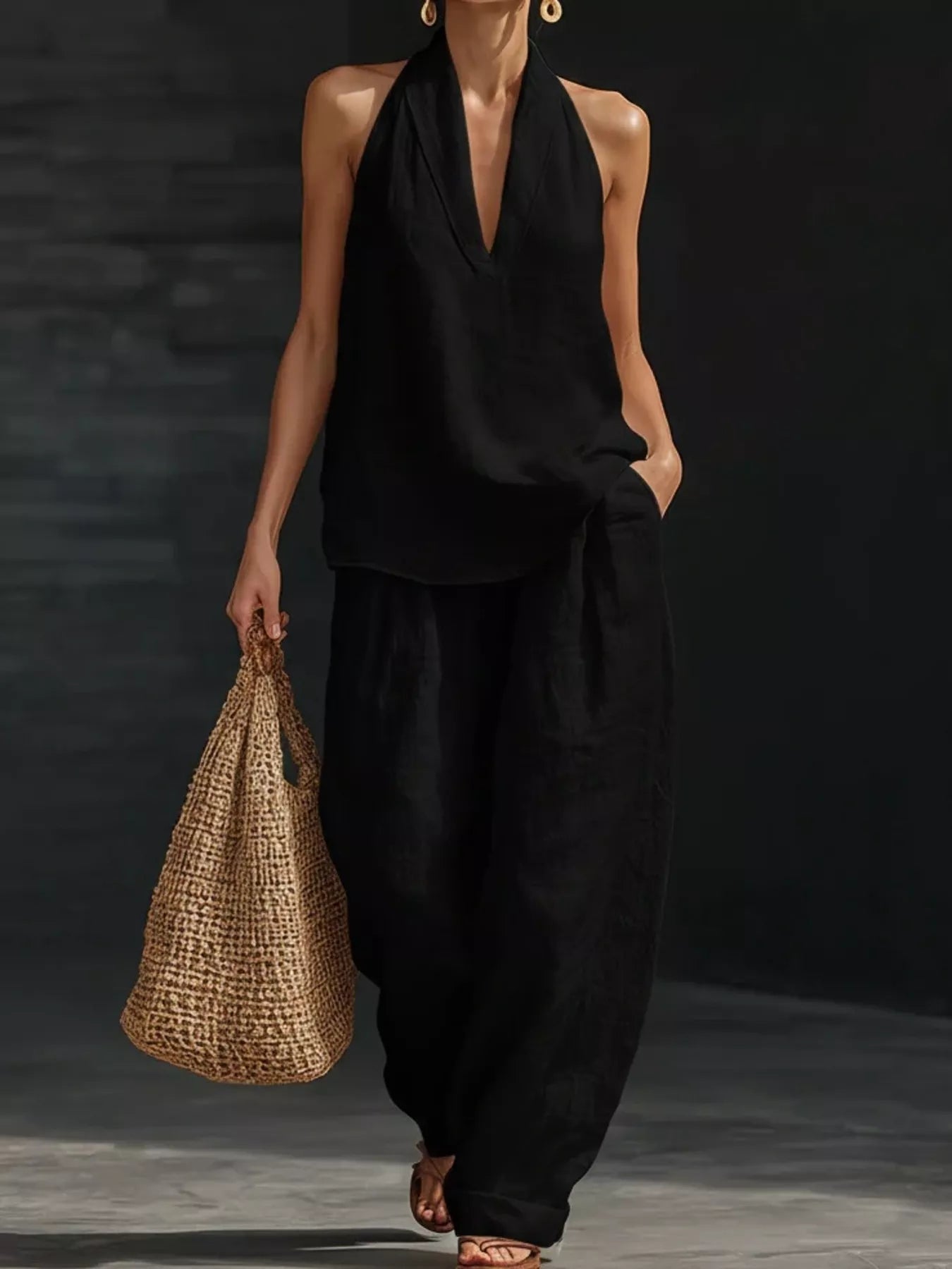 Full Size Halter Neck Top and Wide Leg Pants Set Plus Size