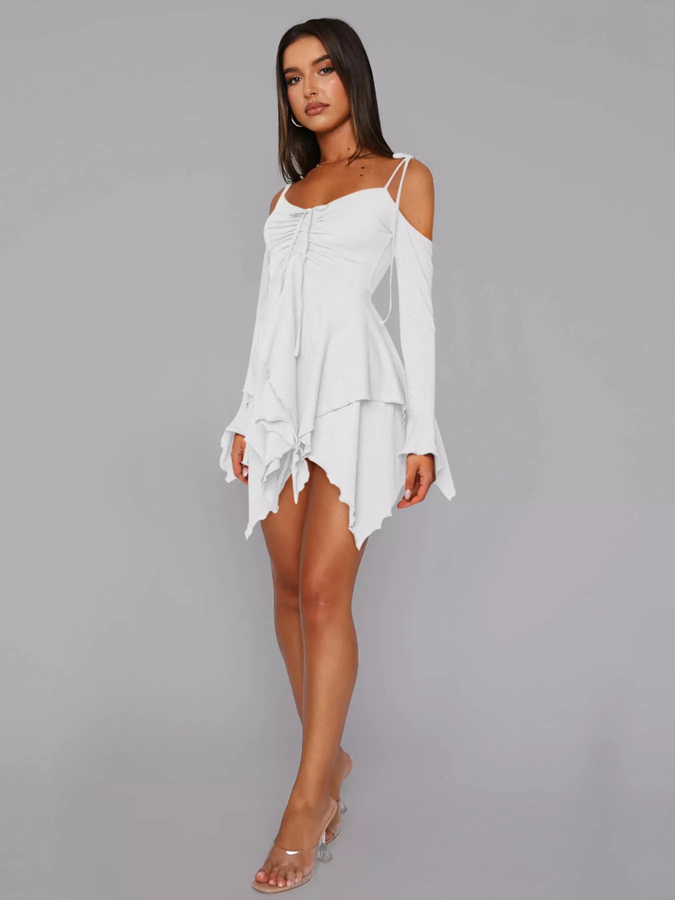 - Features:Ruffled,Drawstring,Asymmetrical,Tied