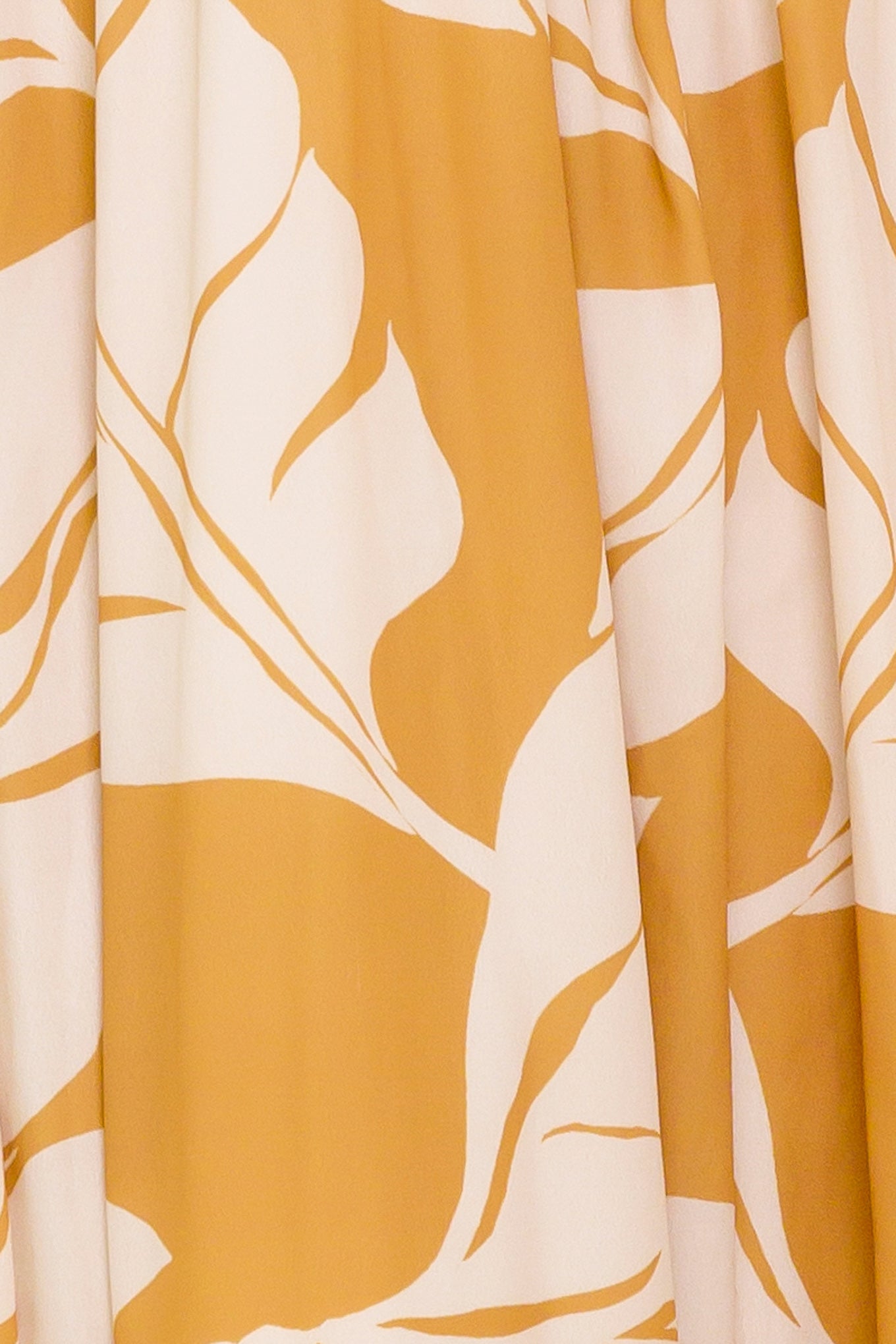 A printed woven maxi dress featuring sweetheart neckline, straps, center front cinched bodice and smocked back bodice