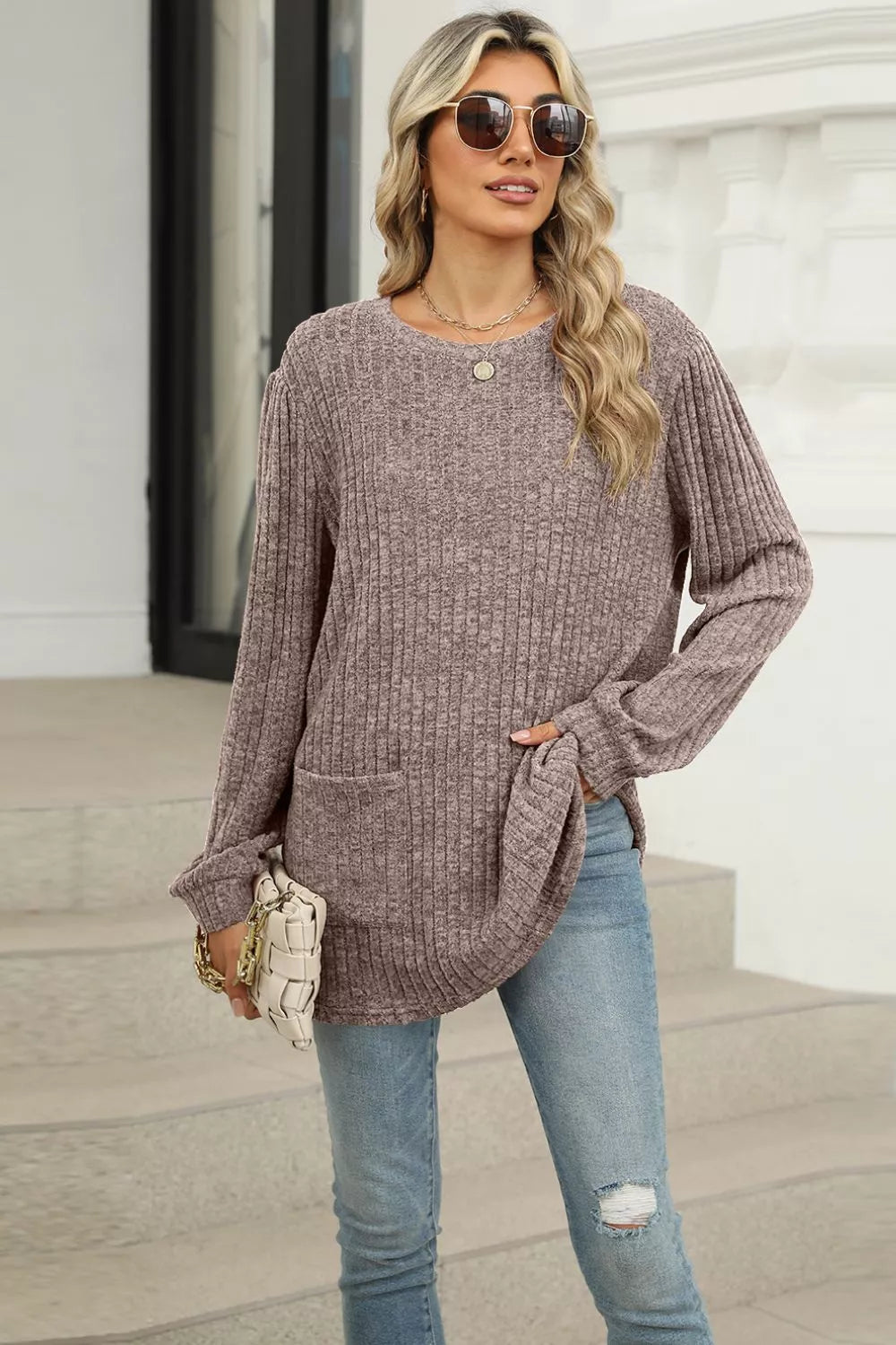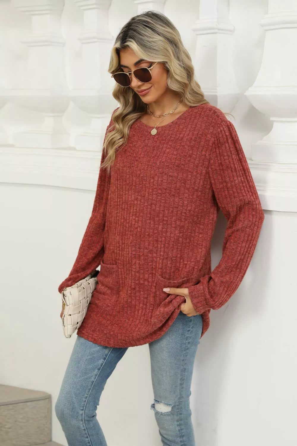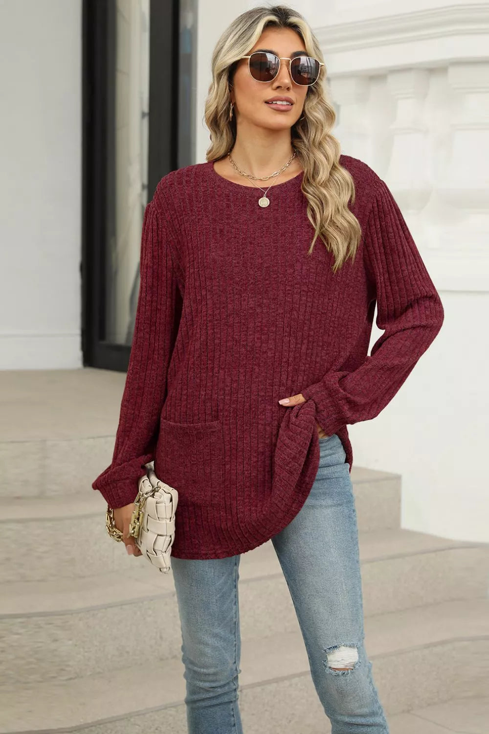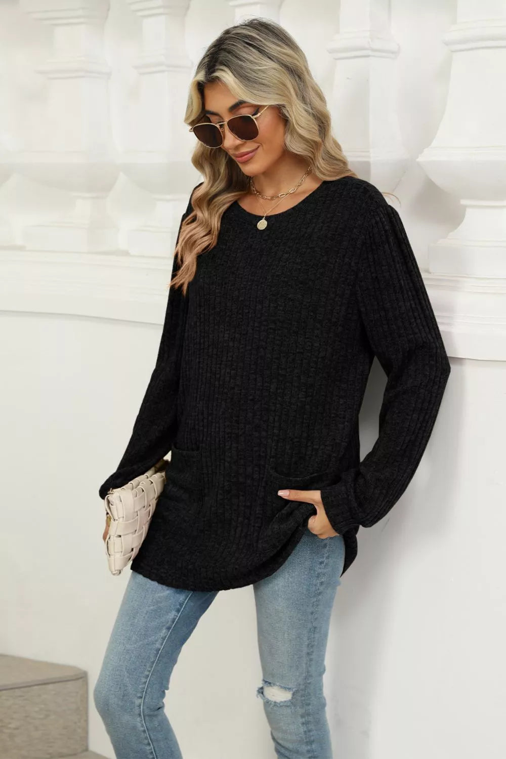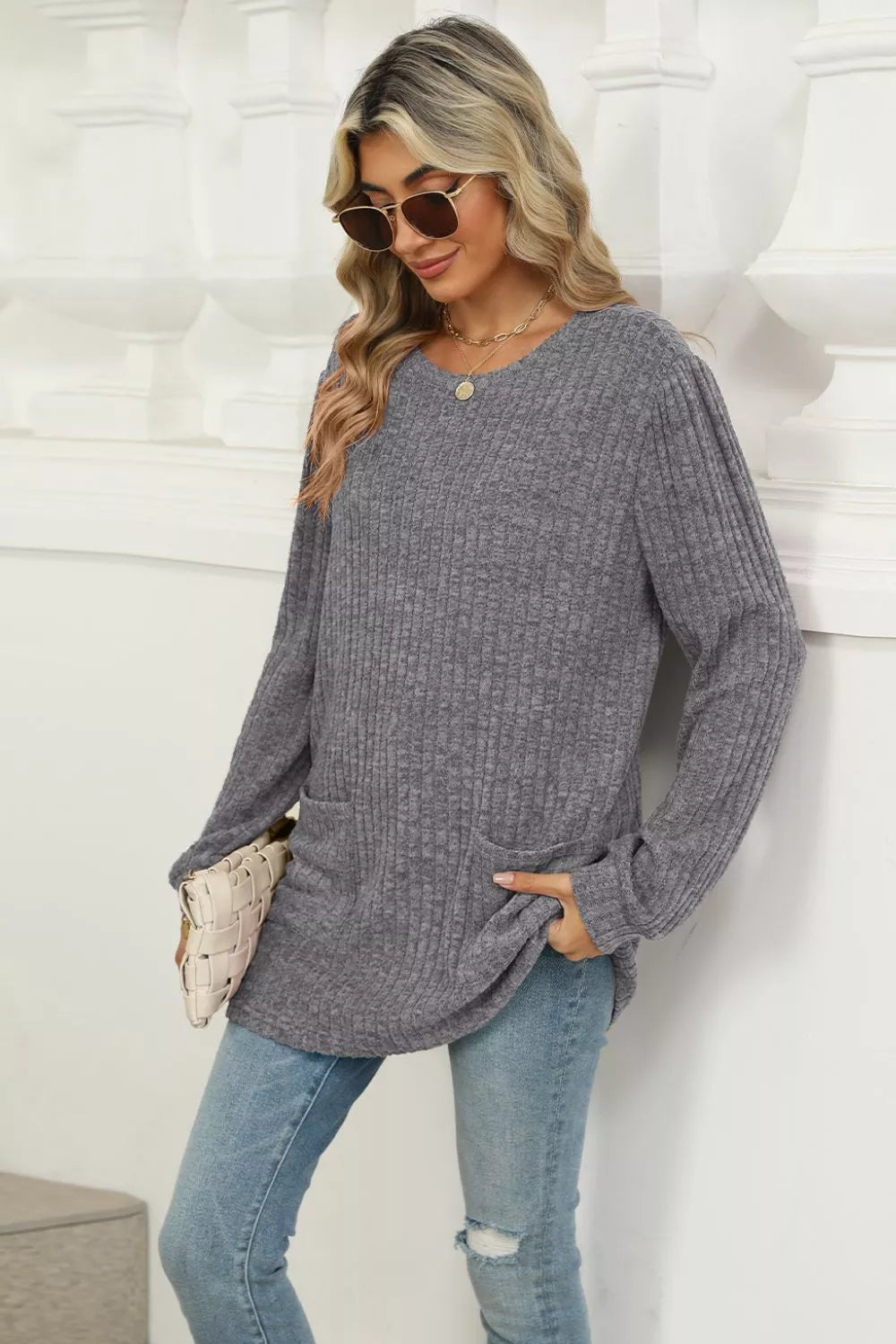 Long Sleeve Ribbed Knit Top with Front Pockets