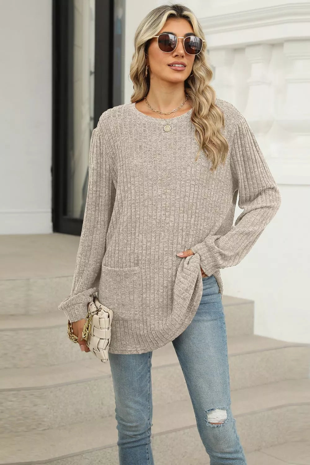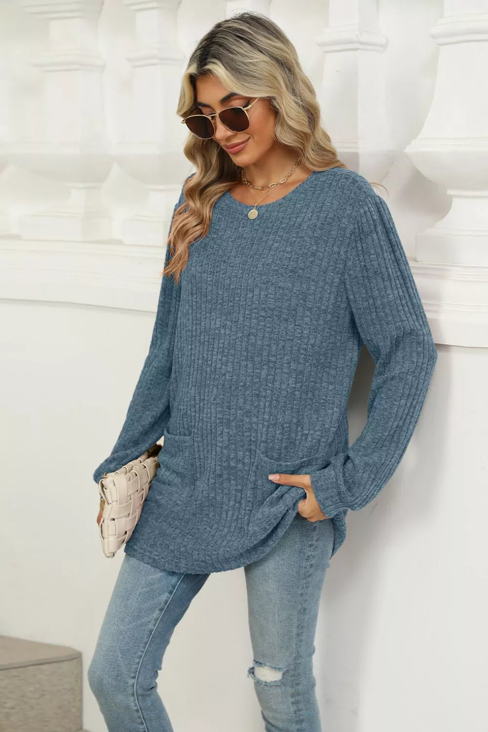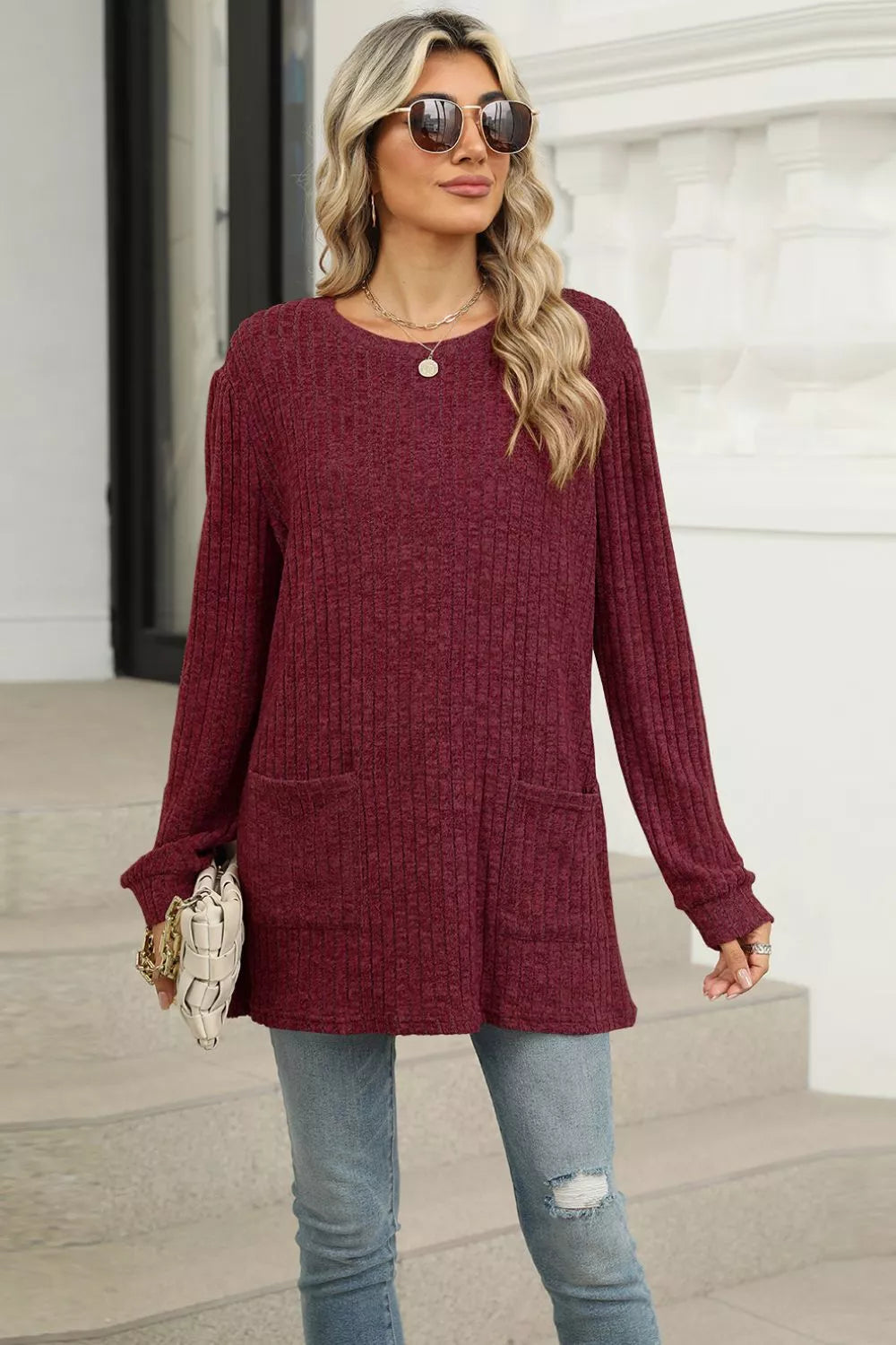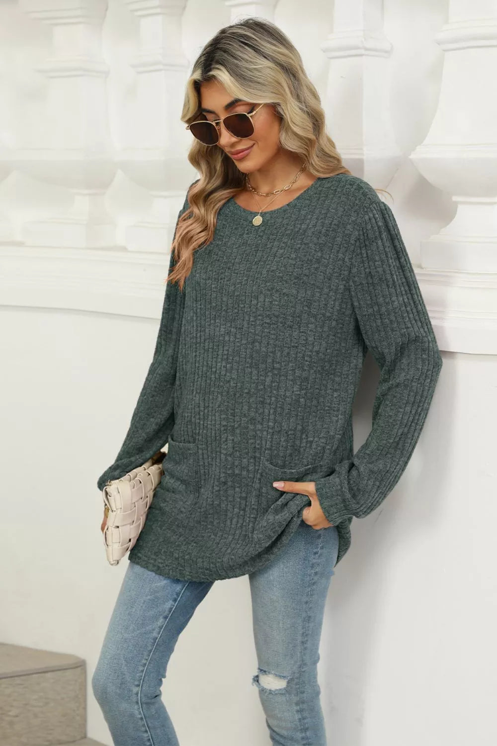 Long Sleeve Ribbed Knit Top with Front Pockets