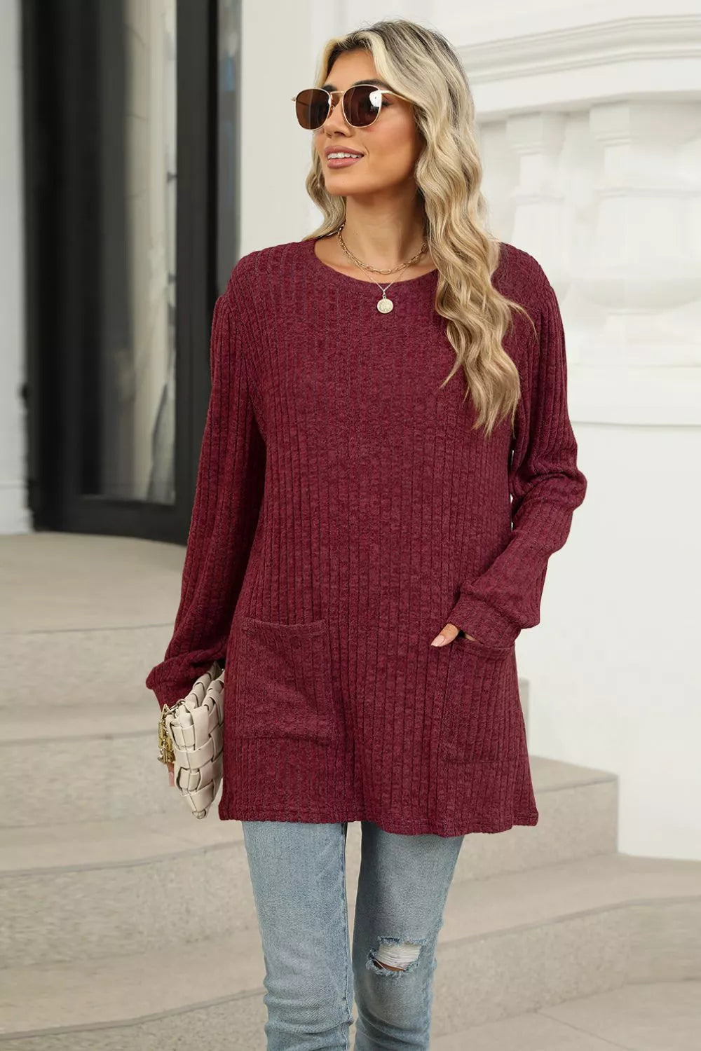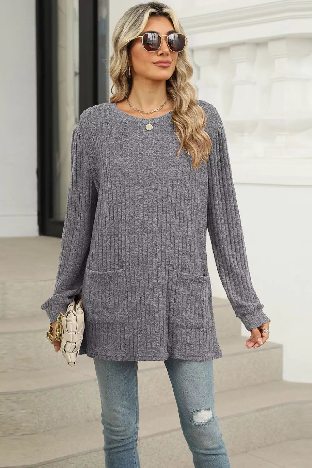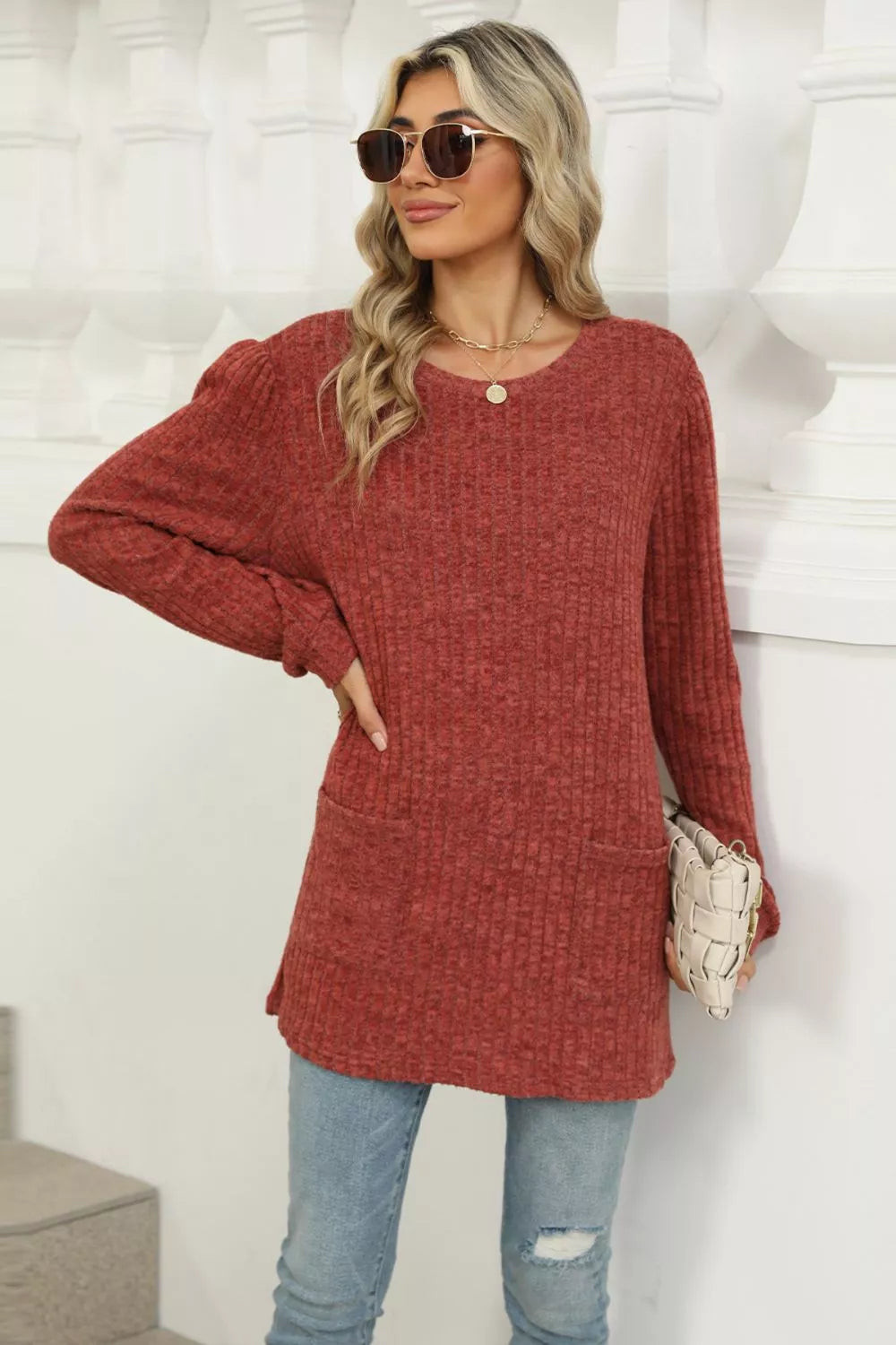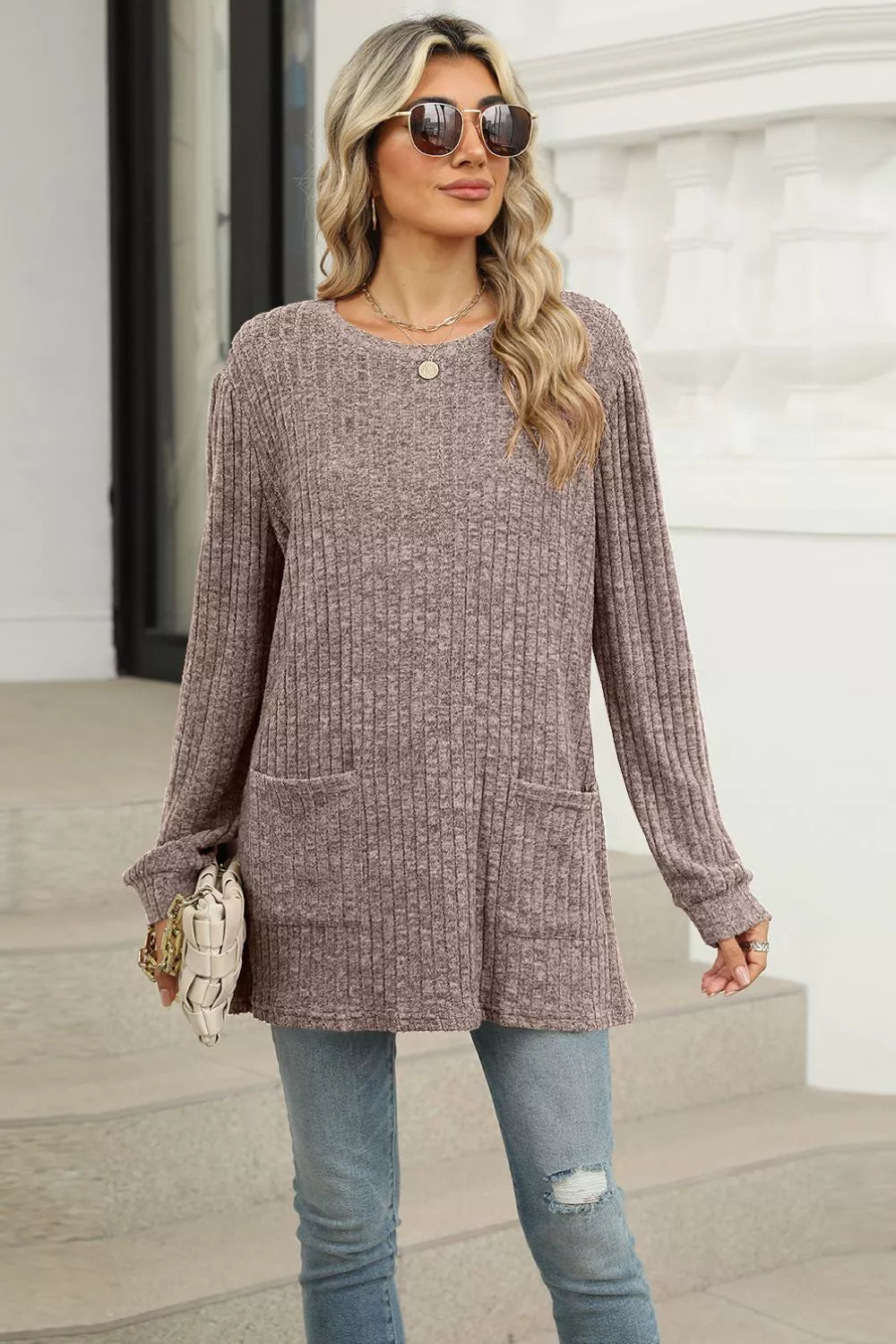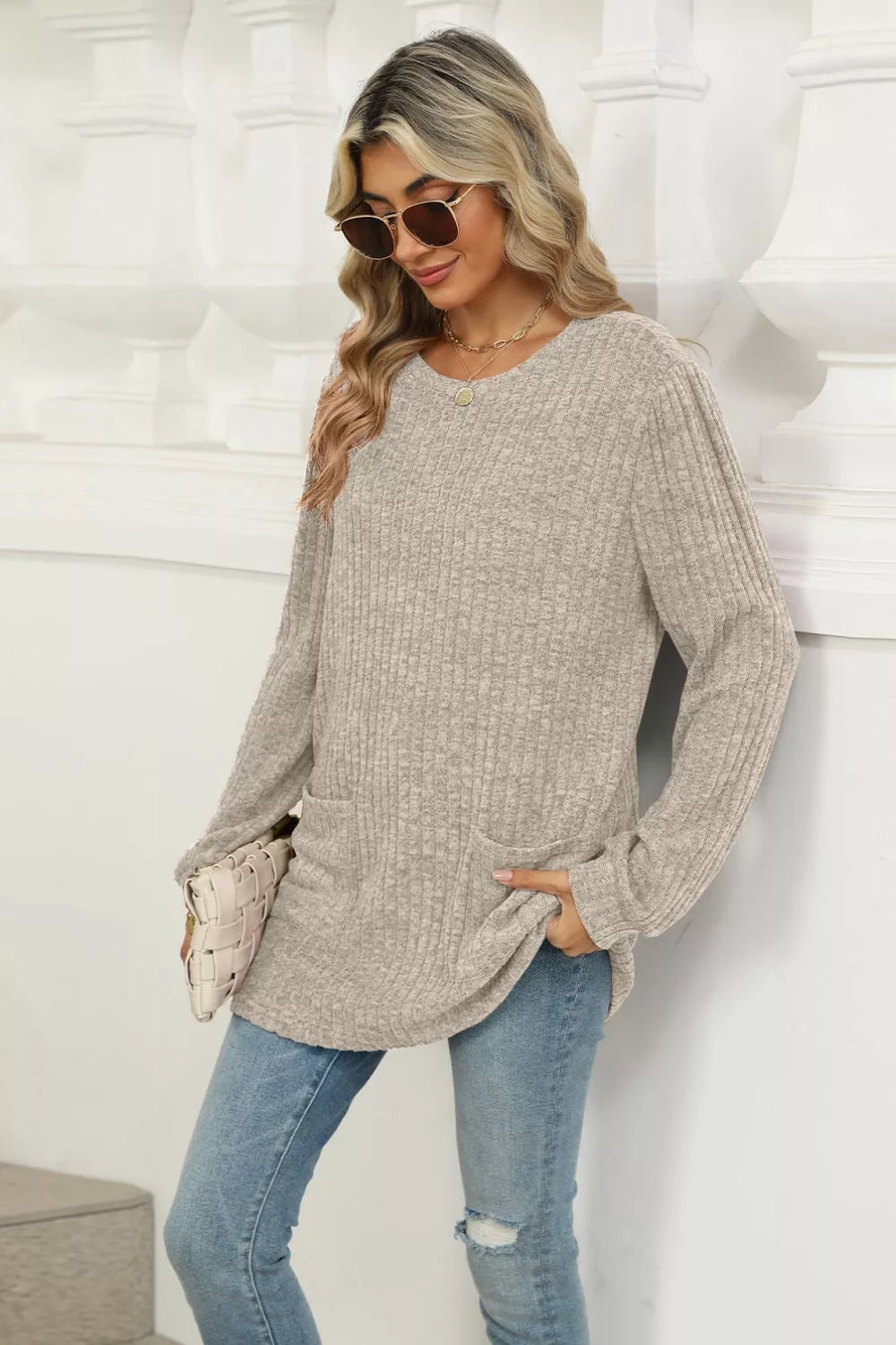 Long Sleeve Ribbed Knit Top with Front Pockets