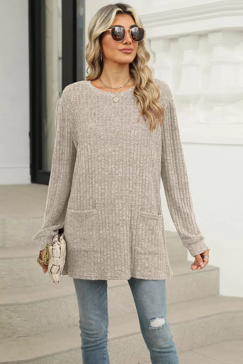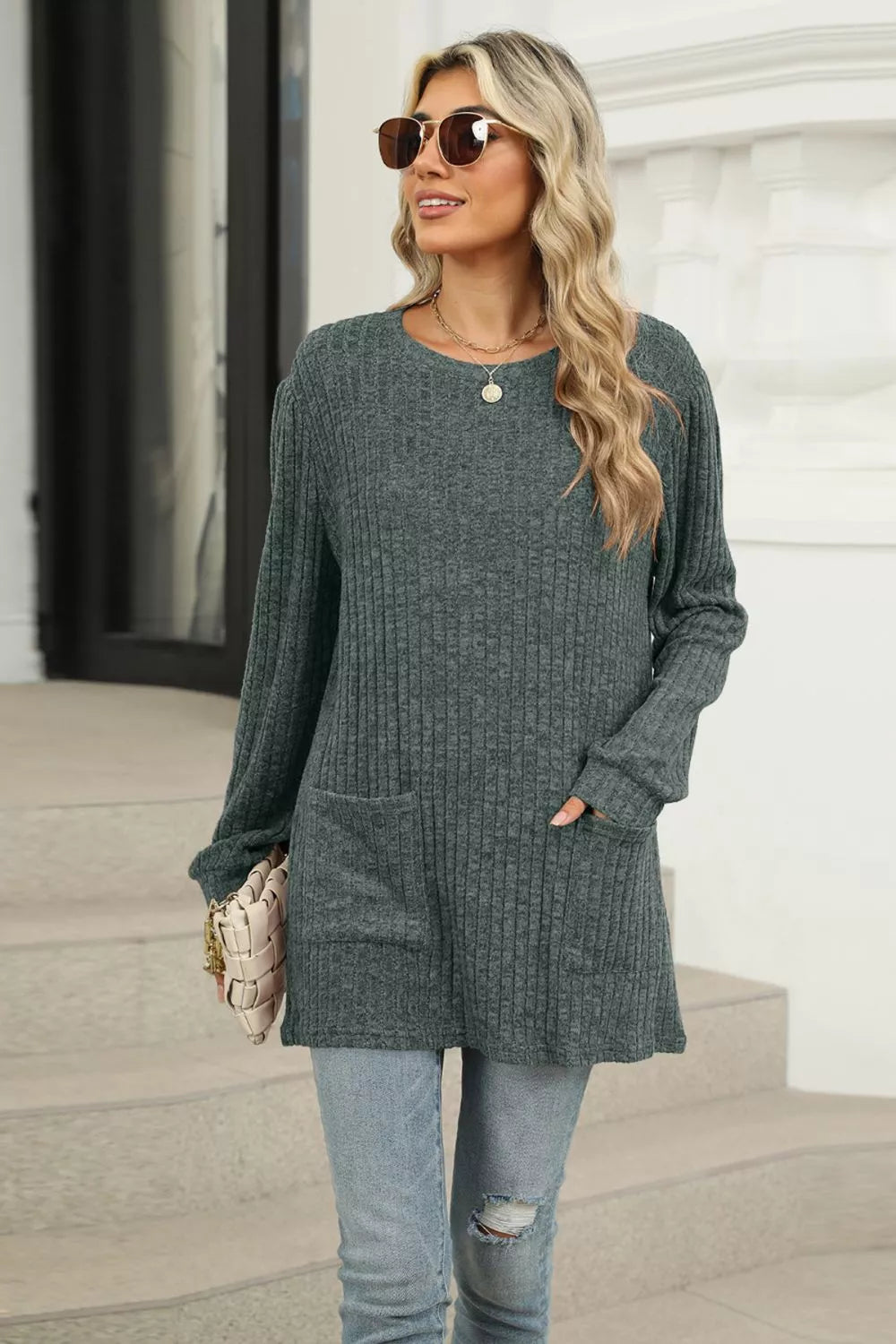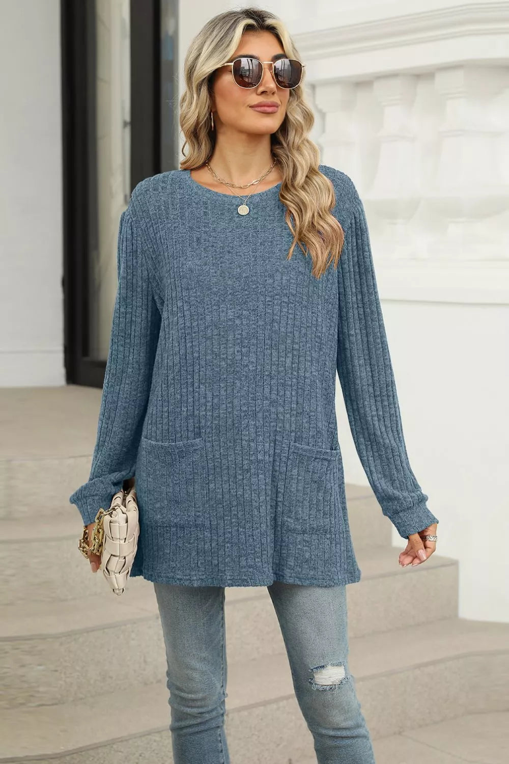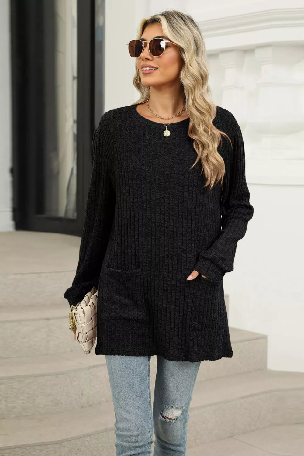 Long Sleeve Ribbed Knit Top with Front Pockets
