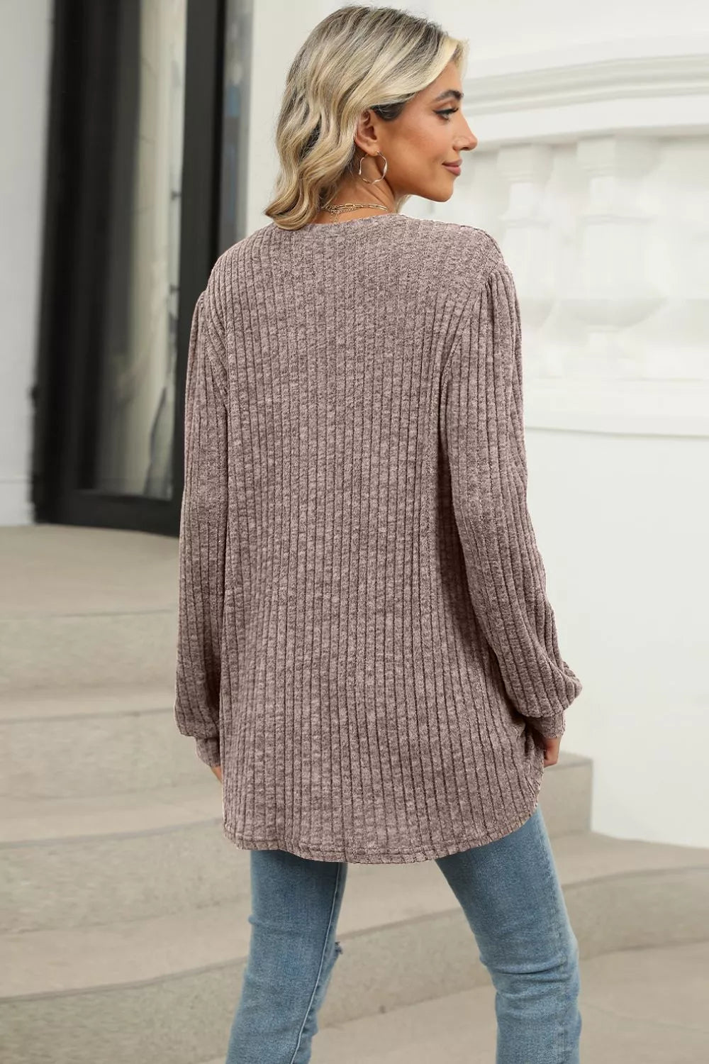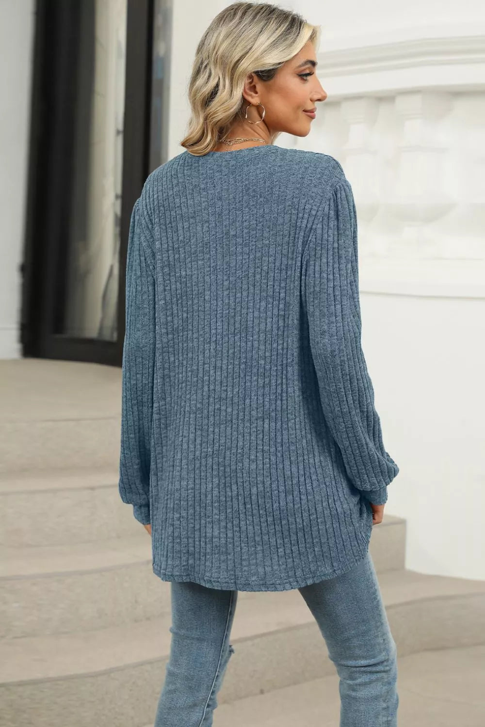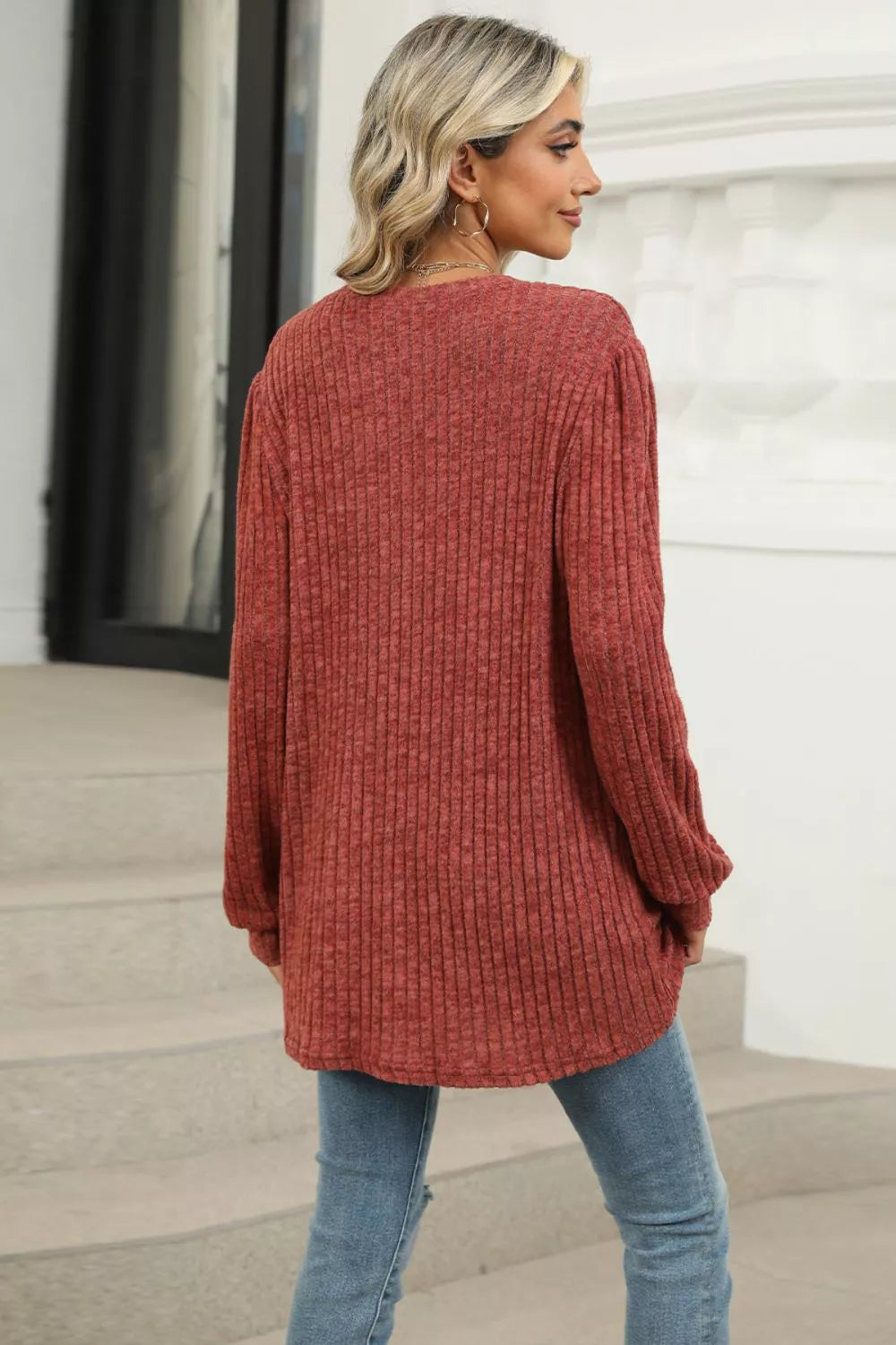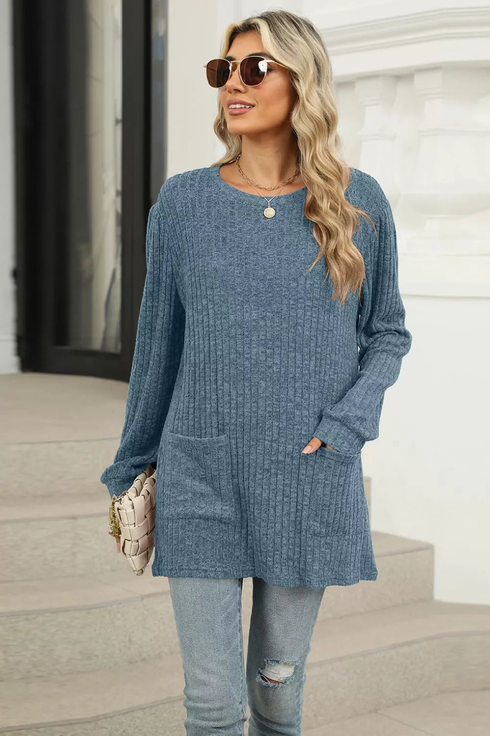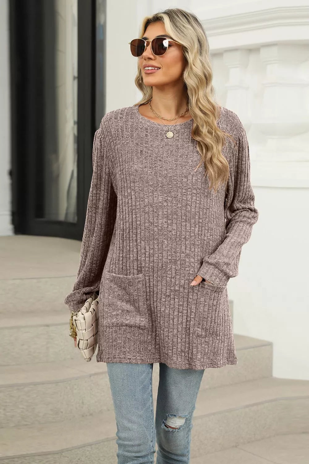Long Sleeve Ribbed Knit Top with Front Pockets