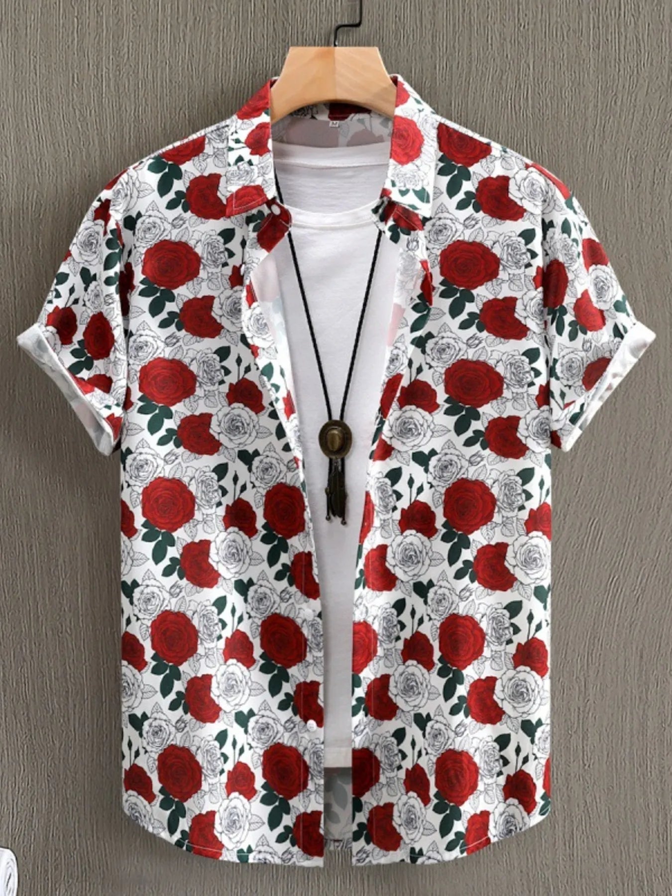 Men's Rose Print Short Sleeve Button-Up Shirt