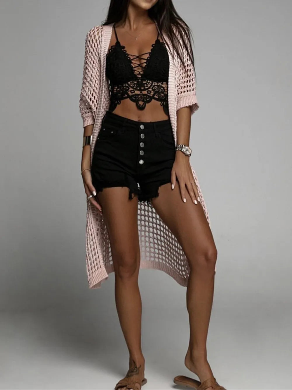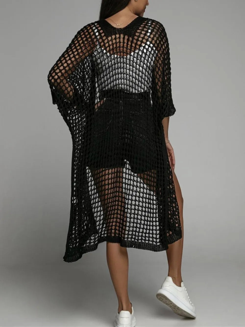 Openwork Open Front Three-Quarter Sleeve Cover Up