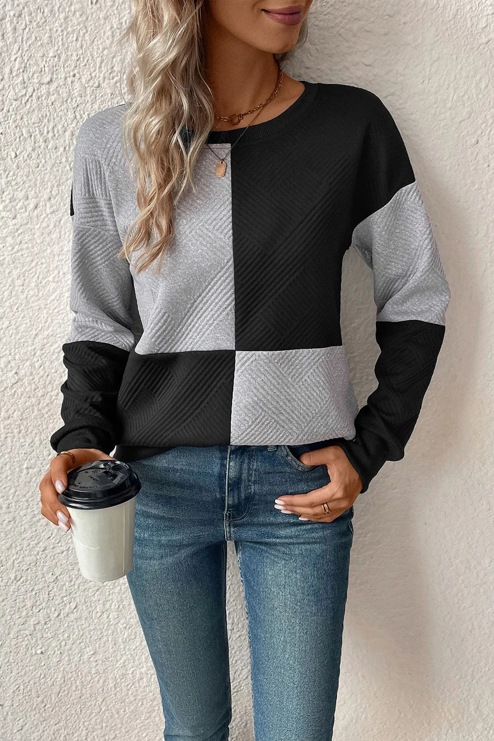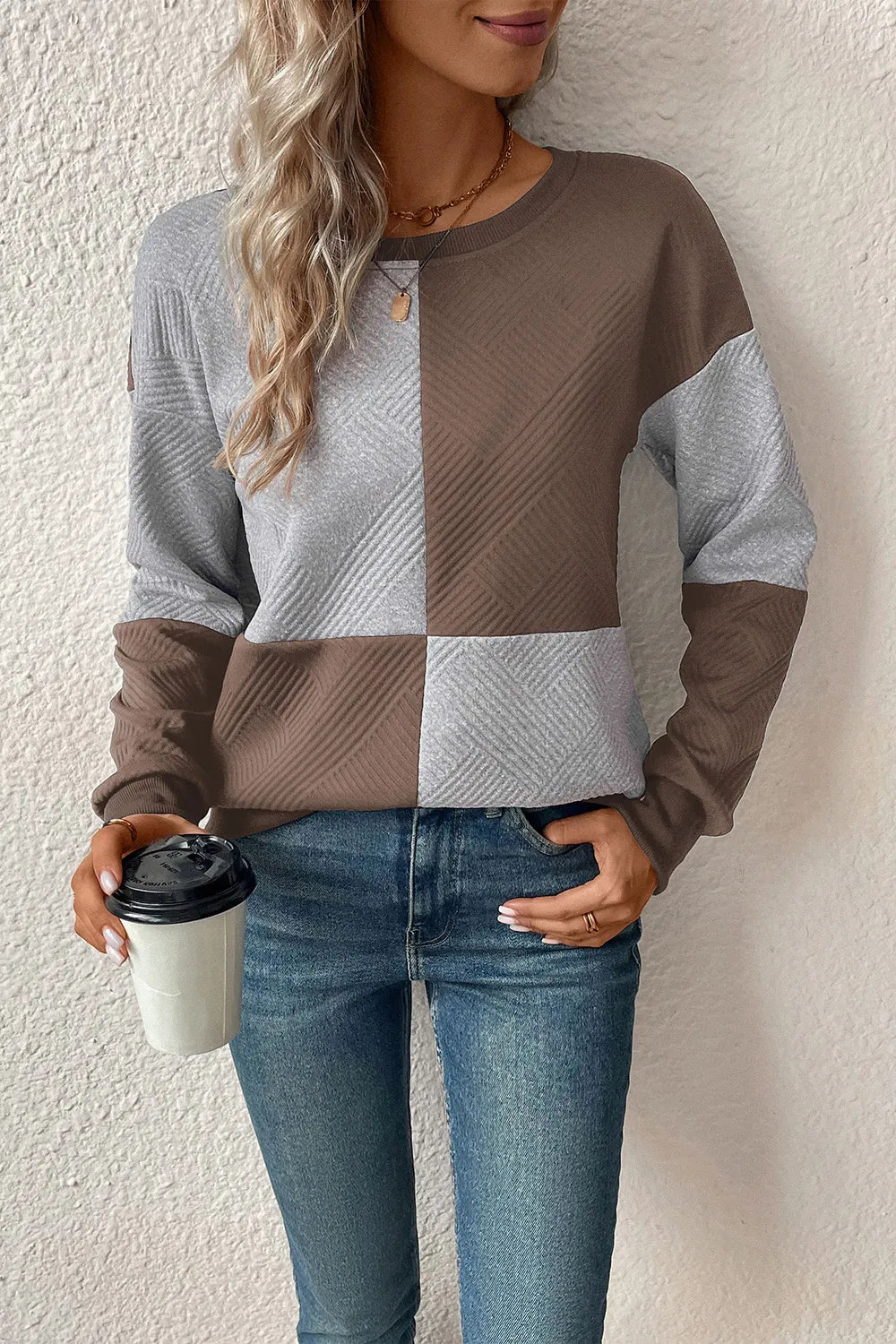 Perfee Textured Color Block Round Neck Sweatshirt