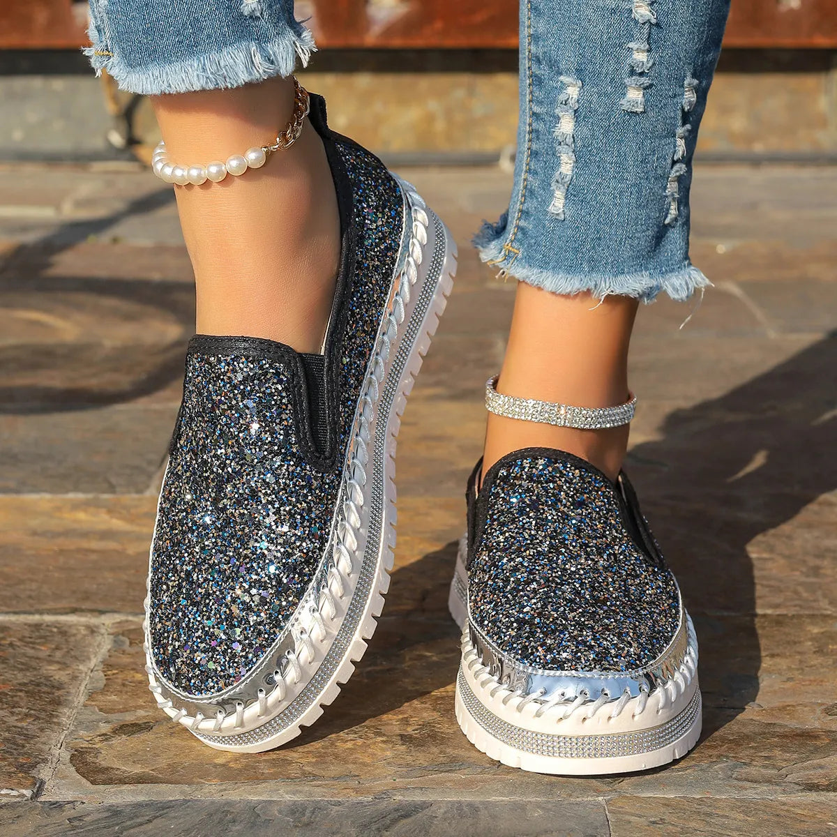 Rhinestone Round Toe Platform Loafers