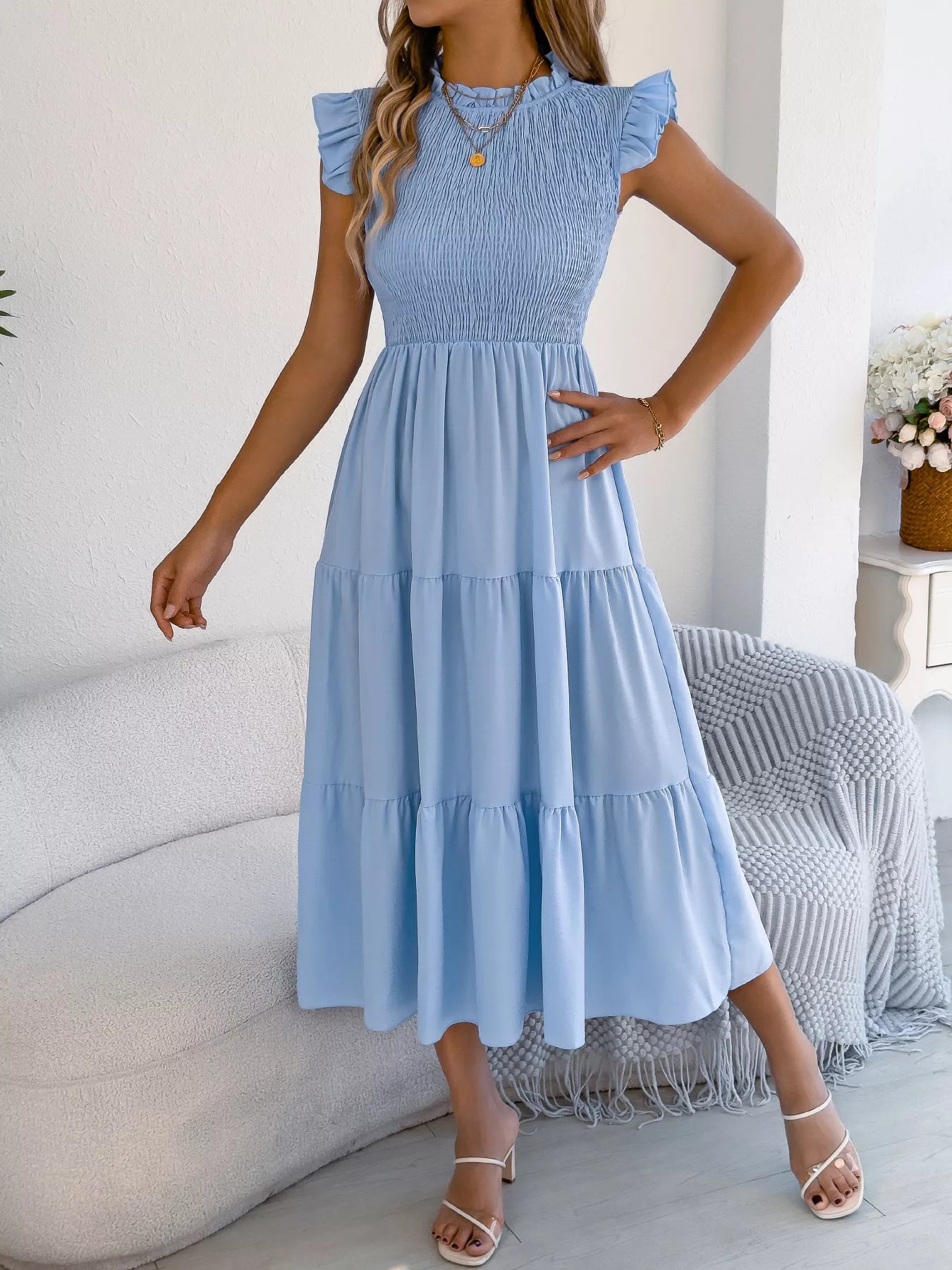 Smocked Ruffled Cap Sleeve Dress