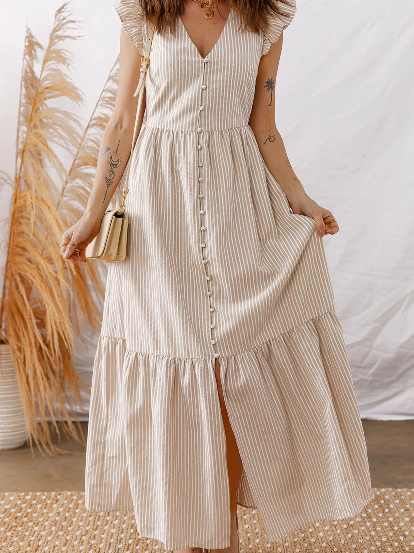 Stripe Flutter Sleeve Buttoned Front Slit Maxi Dress