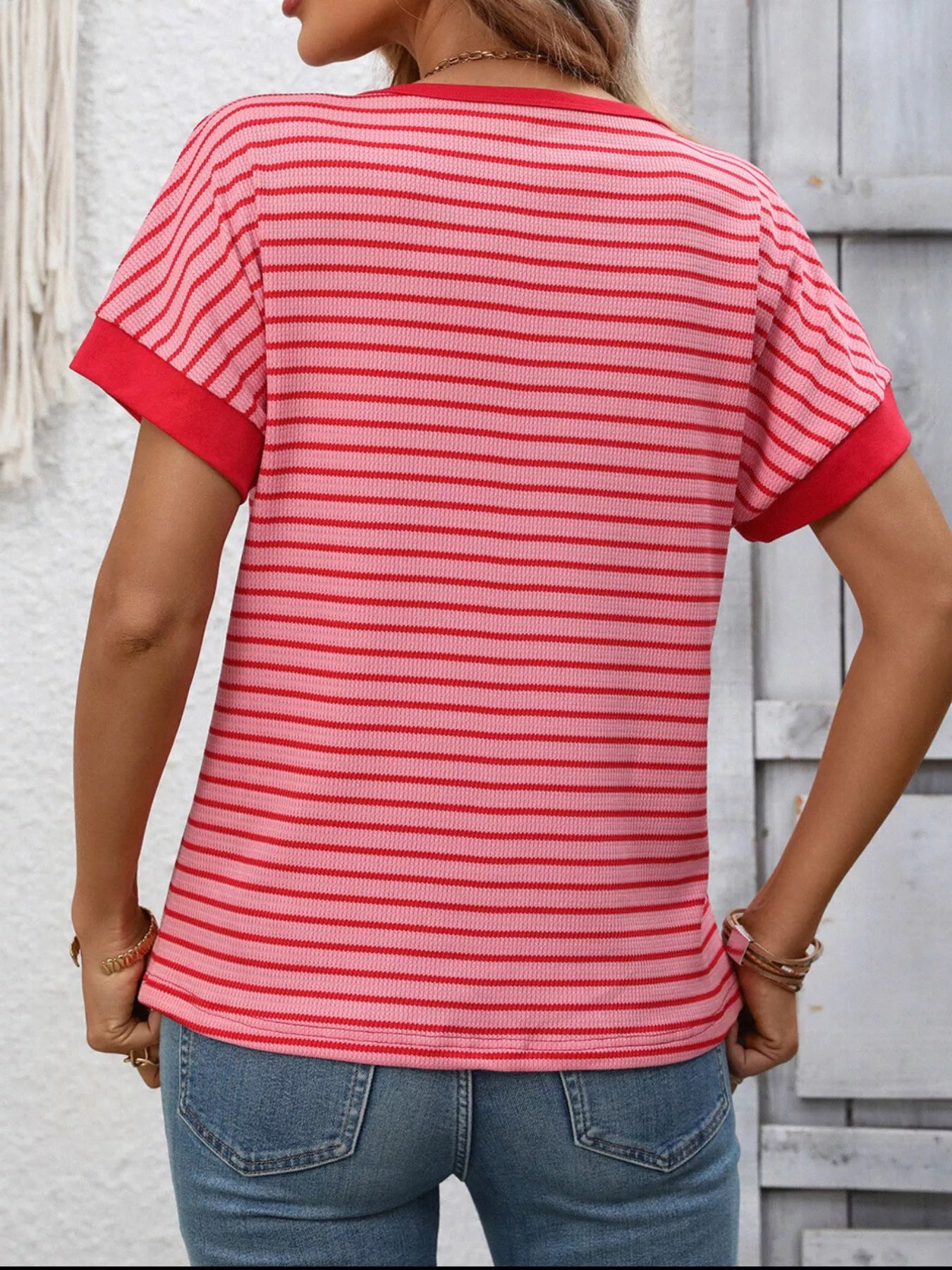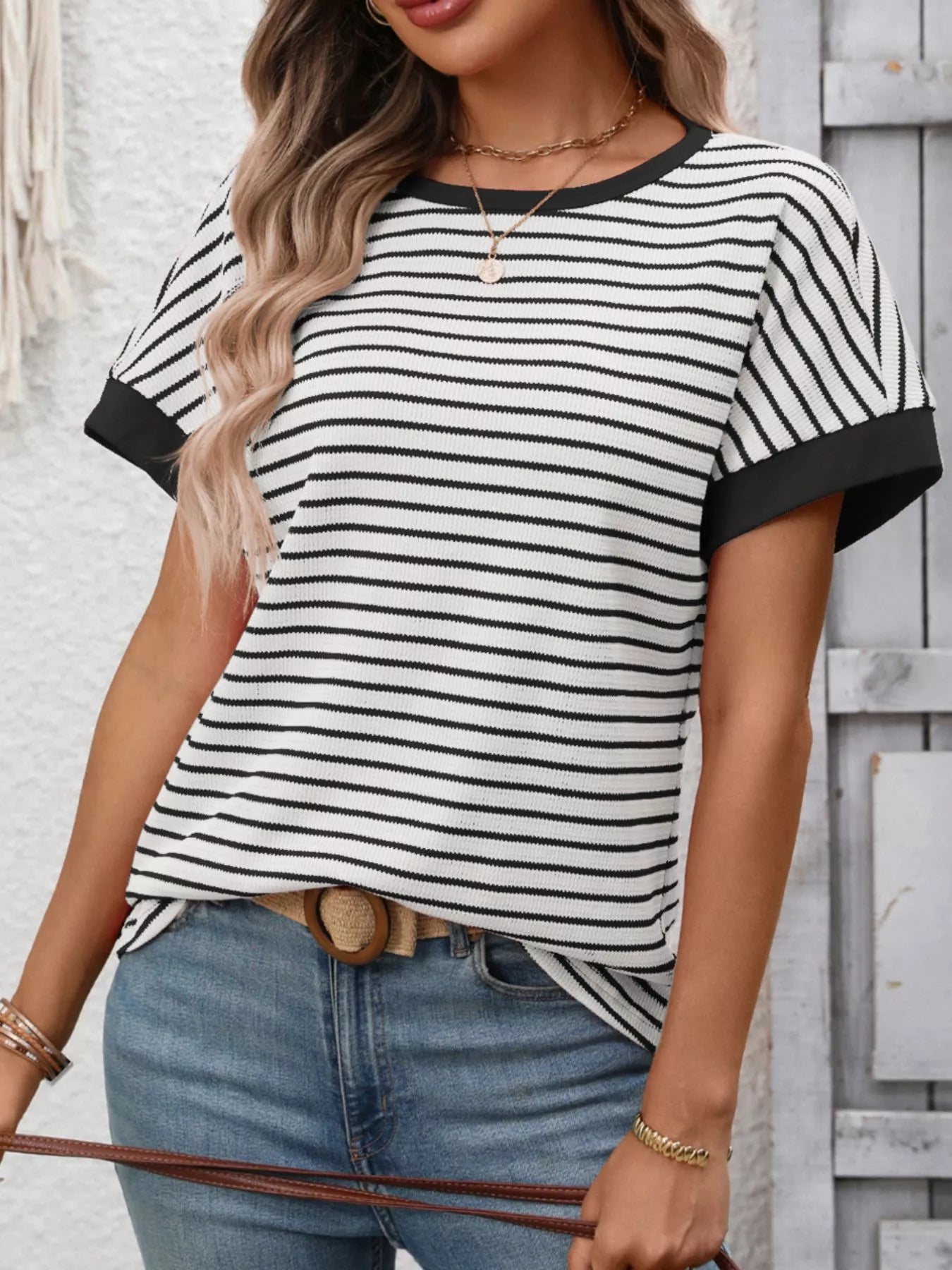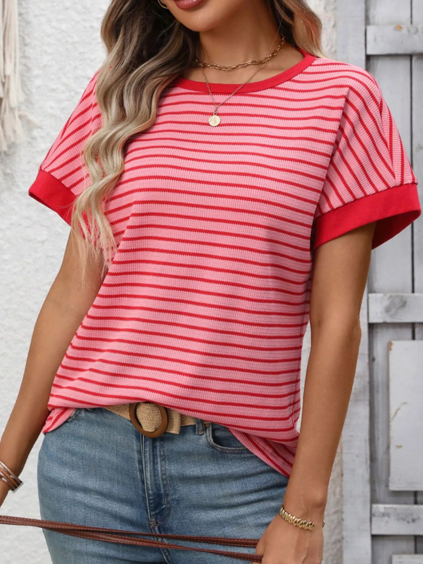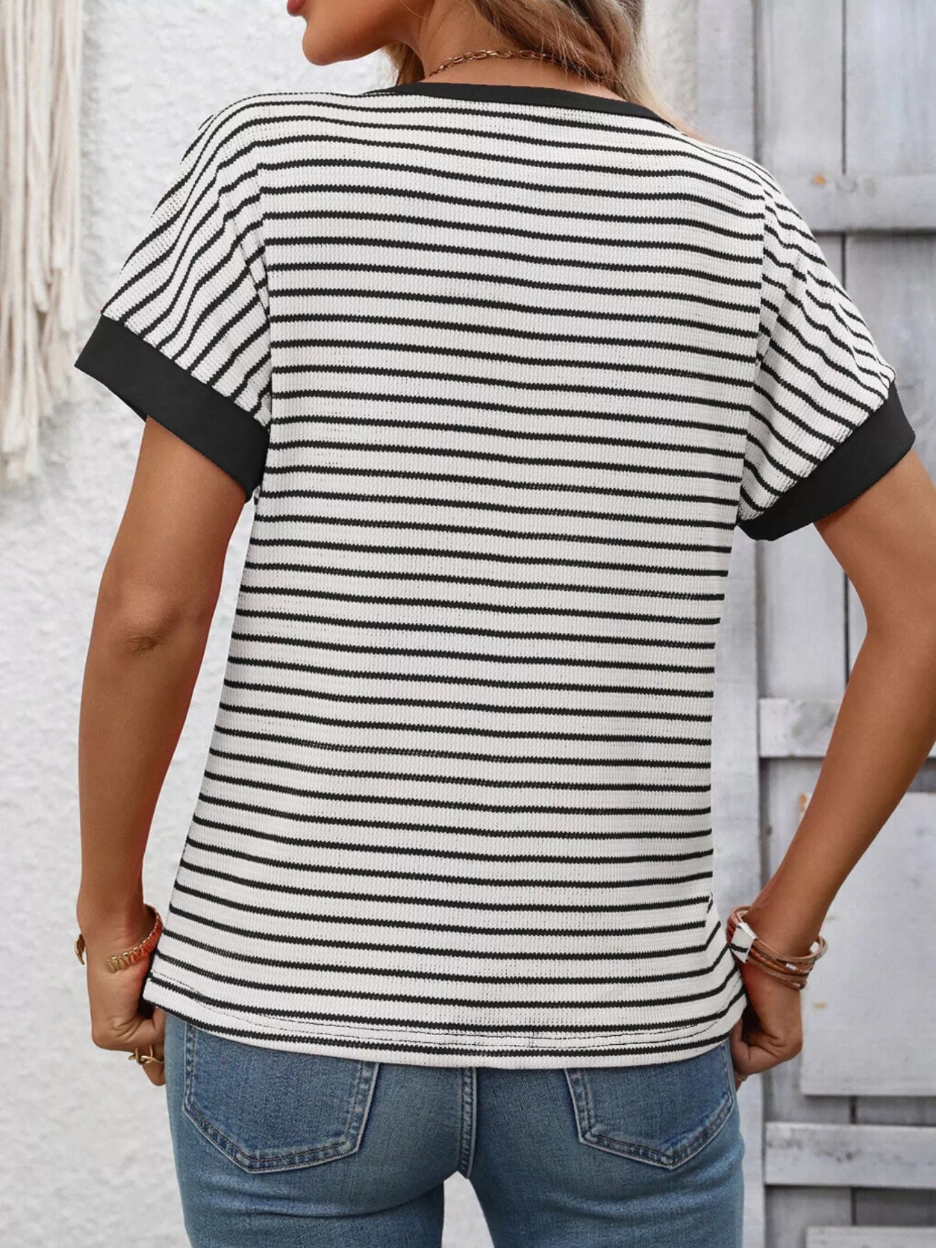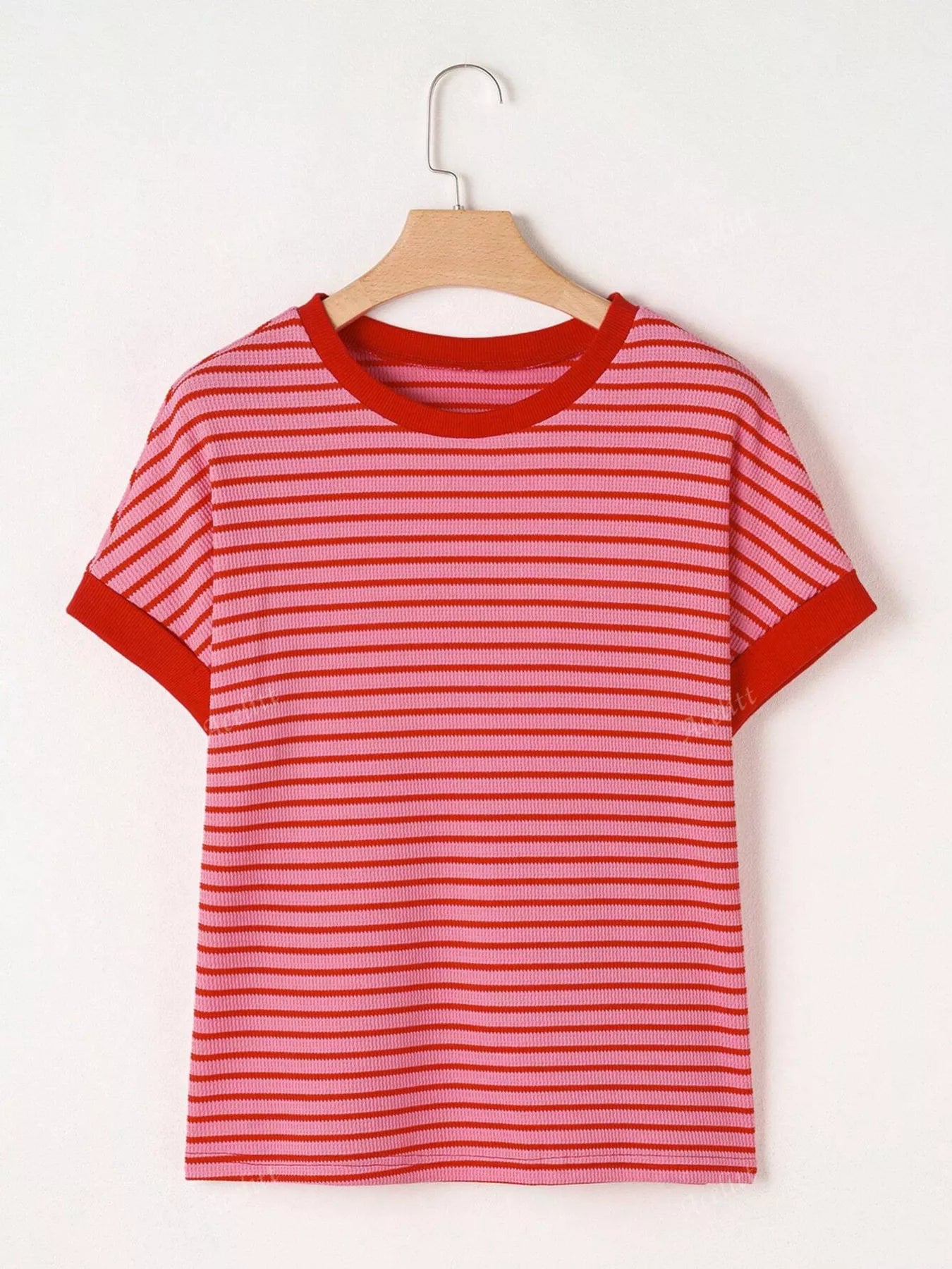 Striped Ribbed Knit Short Sleeve T-Shirt