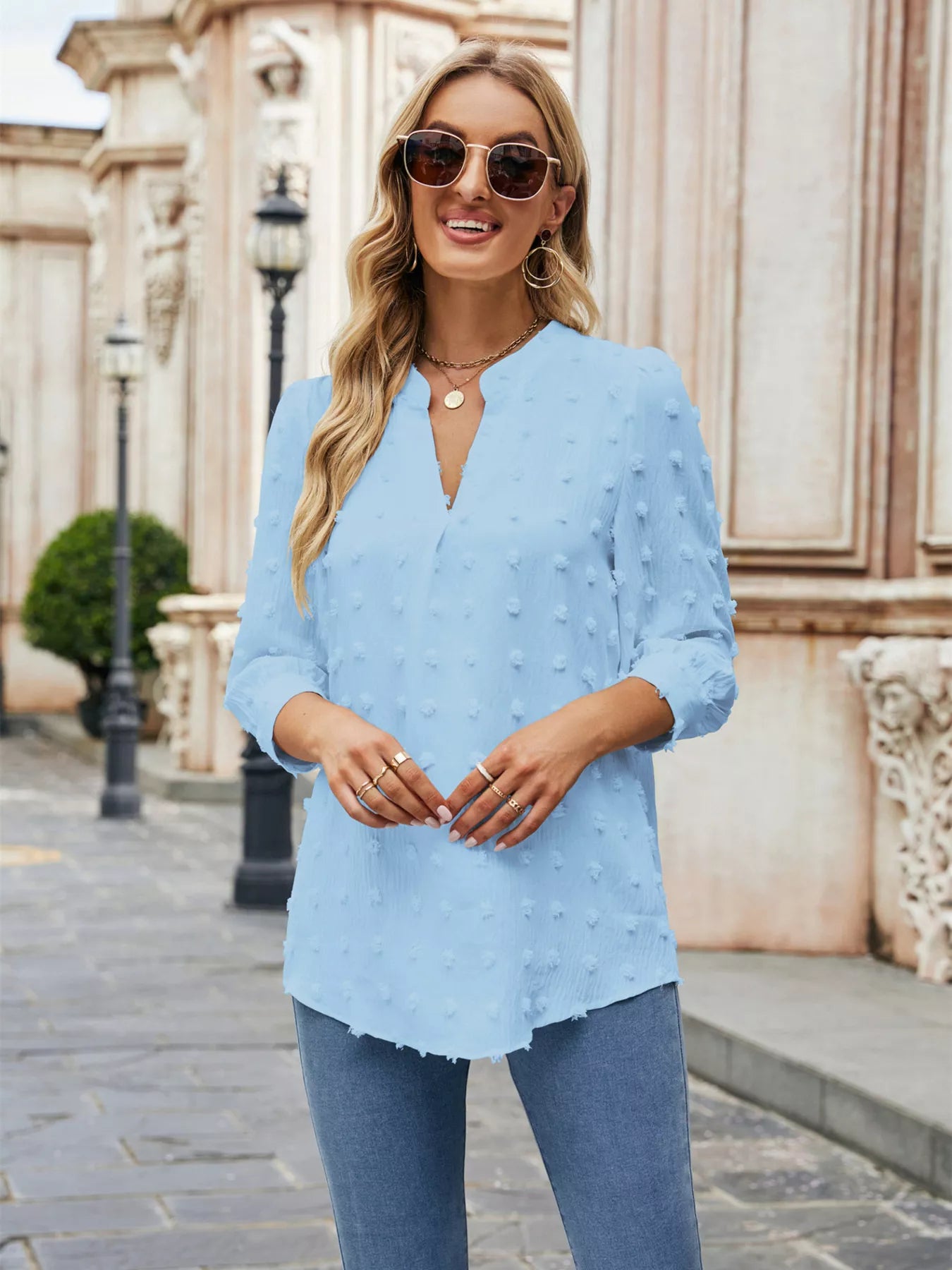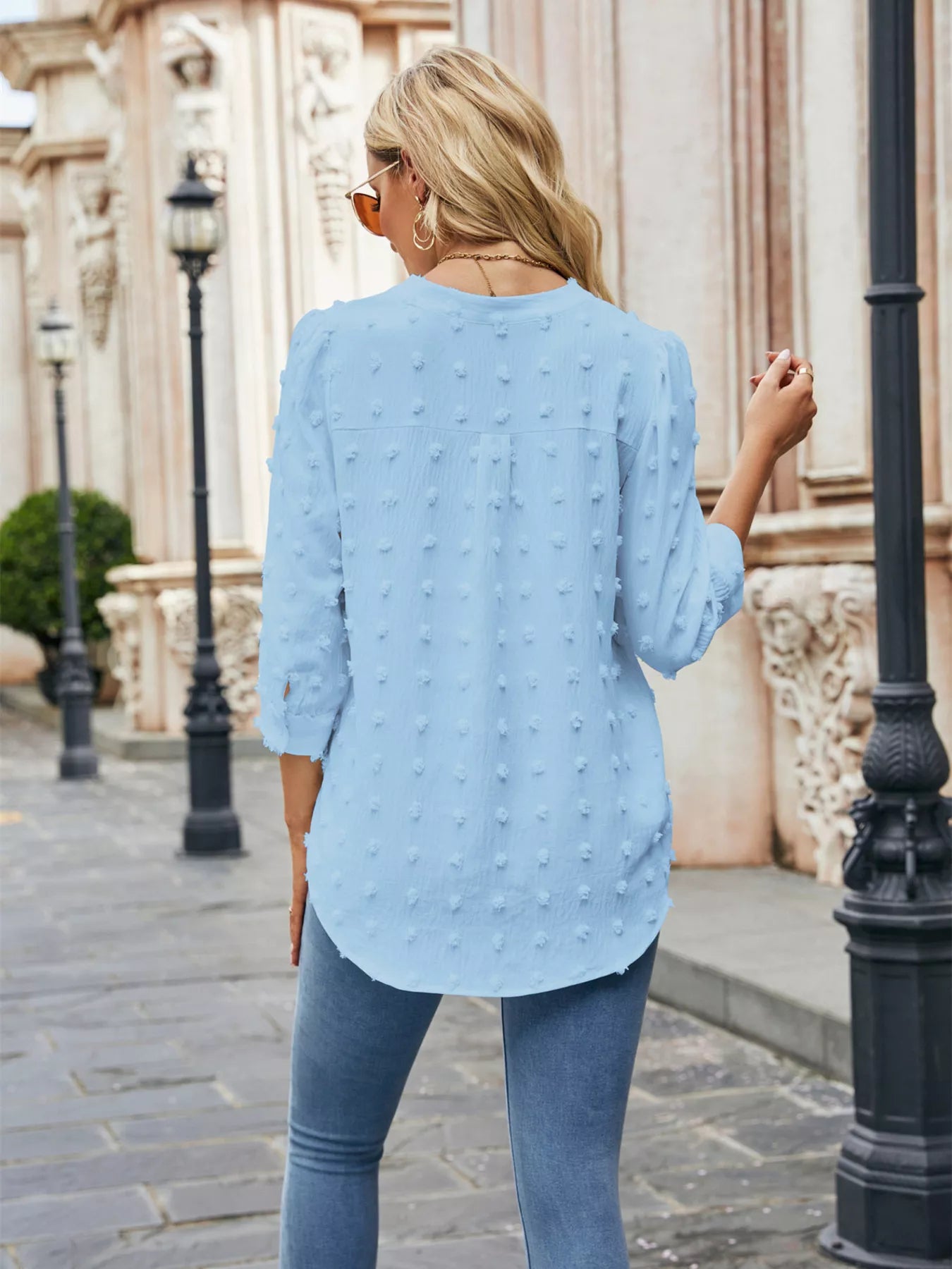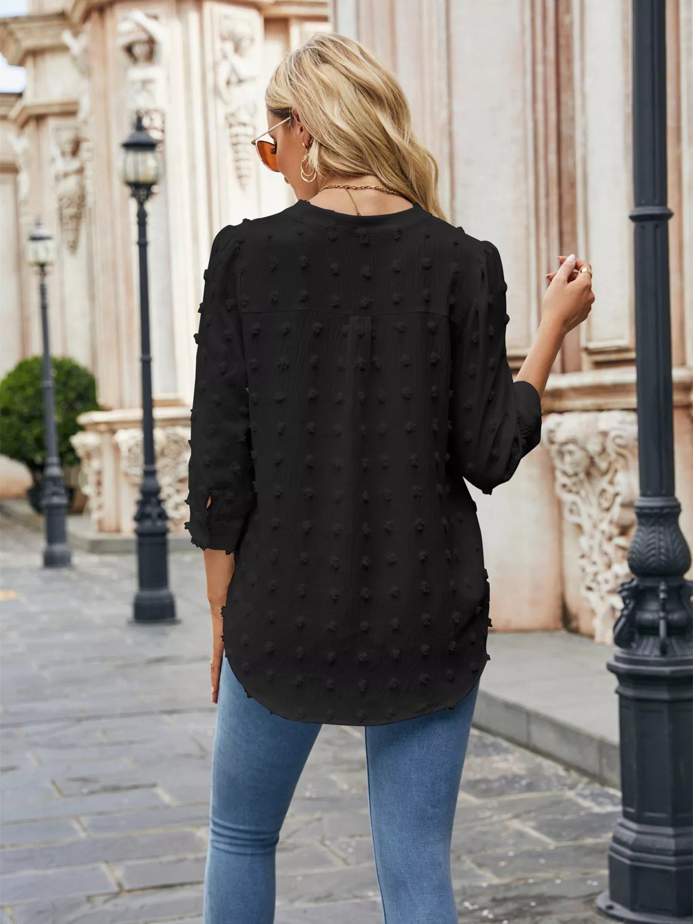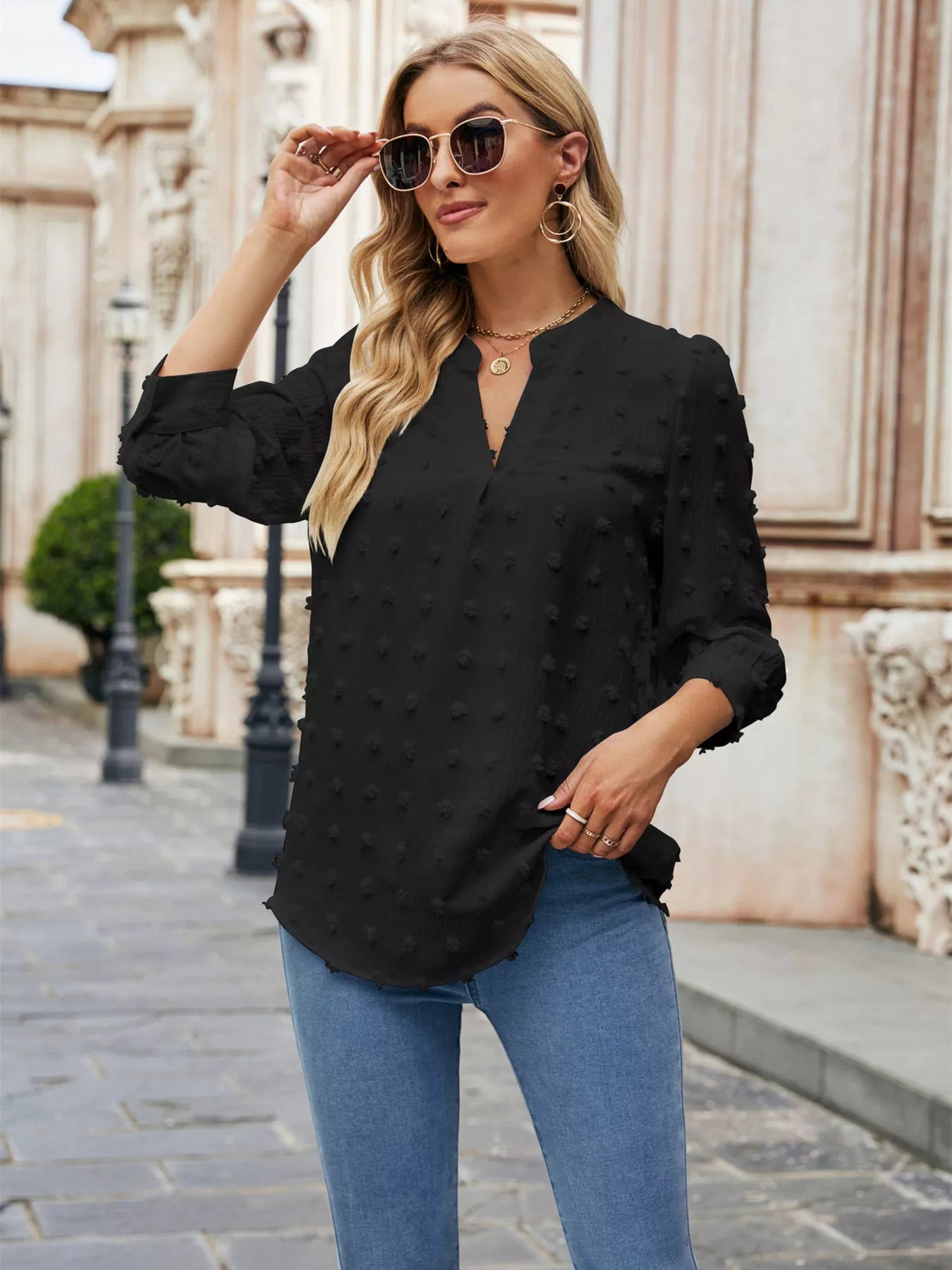 Swiss Dot Notched 3/4 Sleeve Blouse
