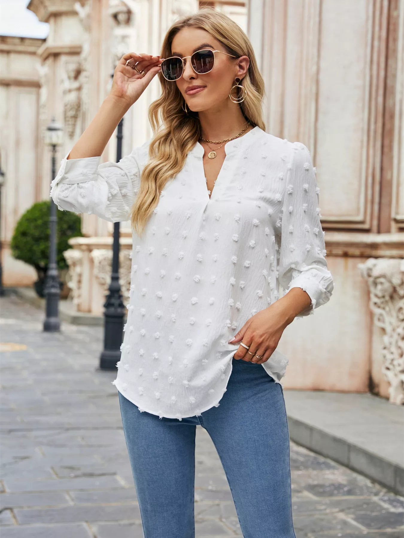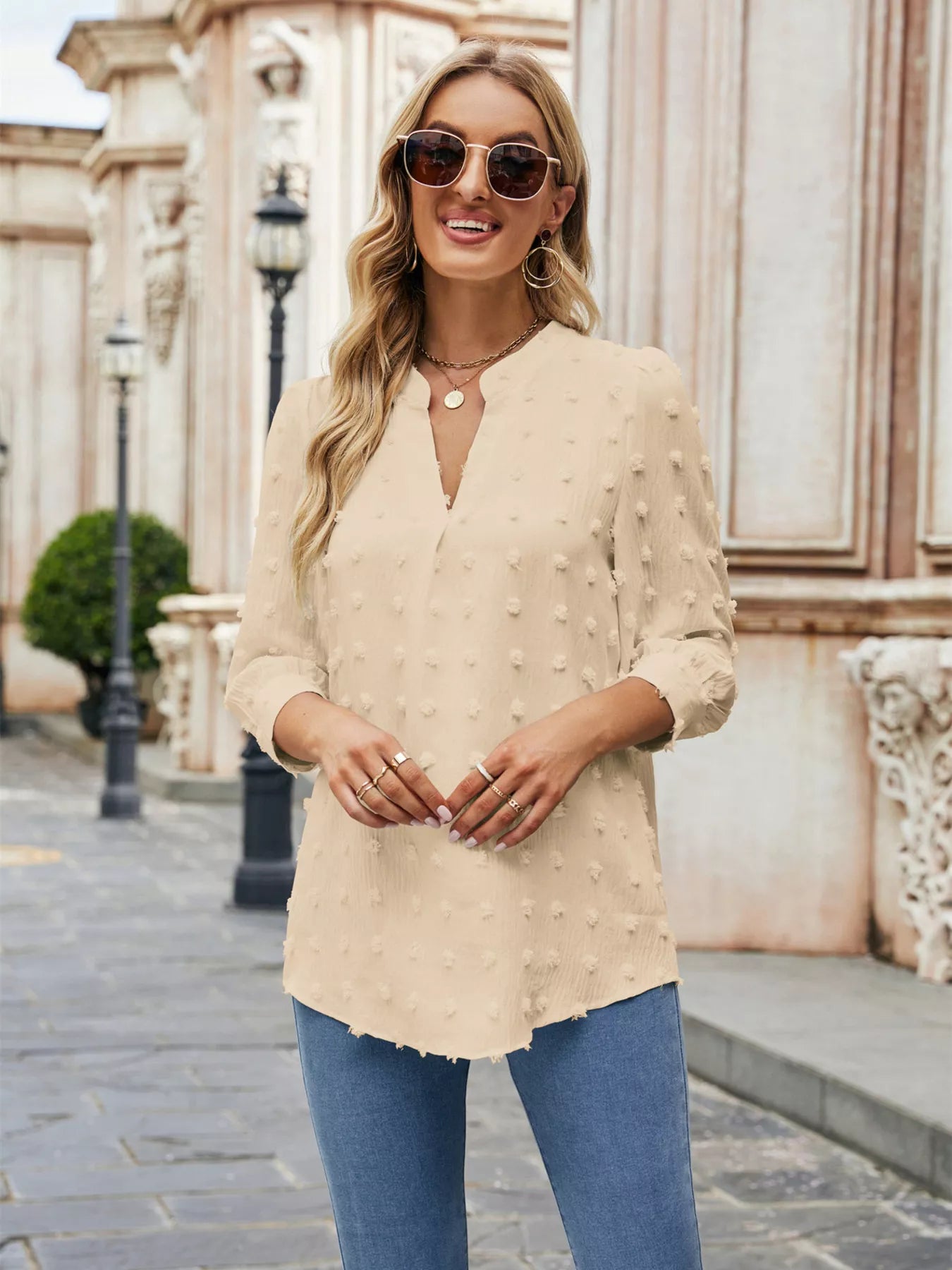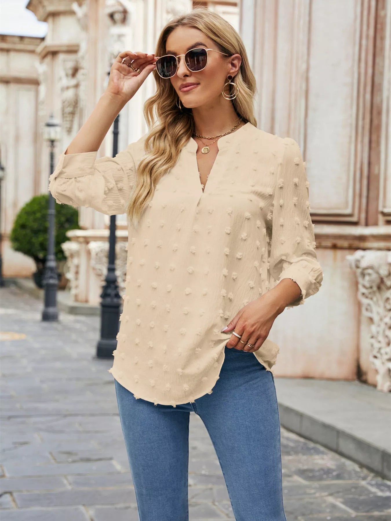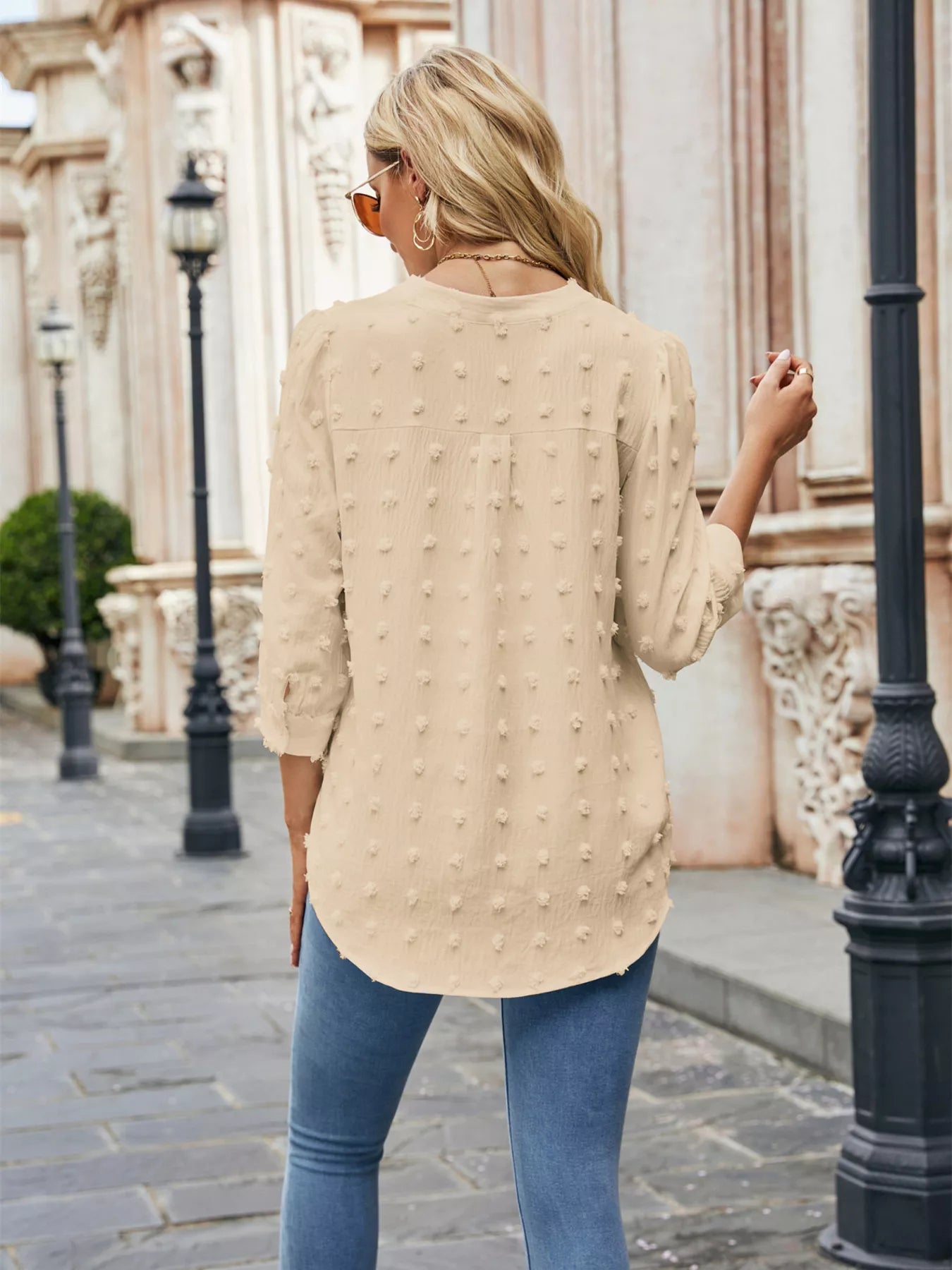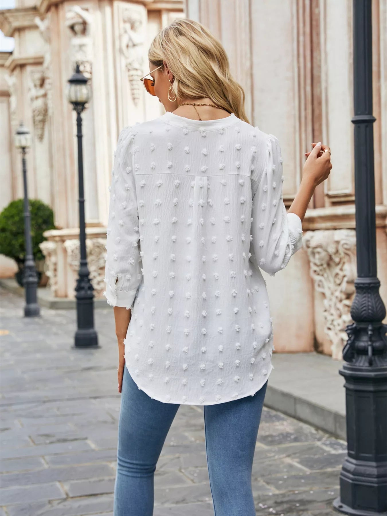Swiss Dot Notched 3/4 Sleeve Blouse