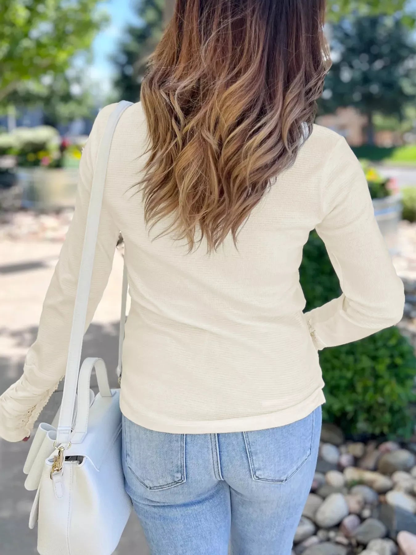 Thermal Knit Lace Ruched Patchwork Long Sleeve V Neck Top