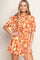 A printed woven romper featuring shirt collar, button down, short sleeve and elasticized waist with tie