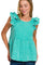 This charming turquoise peplum blouse features a delightful textured fabric with a subtle grid pattern that adds visual interest. The standout flutter sleeves with double-layered ruffles create a romantic, feminine appeal perfect for casual or semi-dressy occasions. Made from lightweight, breathable material ideal for warm weather, this sleeveless top offers both comfort and style. The peplum waist design provides a flattering fit that accentuates the waistline while offering a relaxed, comfortable feel through the bodice. The vibrant turquoise color makes it a perfect statement piece for spring and summer wardrobes.