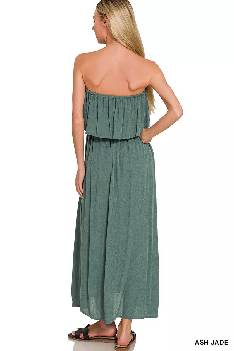 The woven crinkle strapless maxi dress is a breezy and elegant piece perfect for warm weather. Featuring a crinkled texture, this dress offers a relaxed and effortless look. The strapless design adds a touch of sophistication and showcases shoulders beautifully. With a maxi length, this dress is both stylish and versatile for various occasions. Ideal for summer gatherings or beach outings, this dress is a must-have for a chic and comfortable wardrobe.